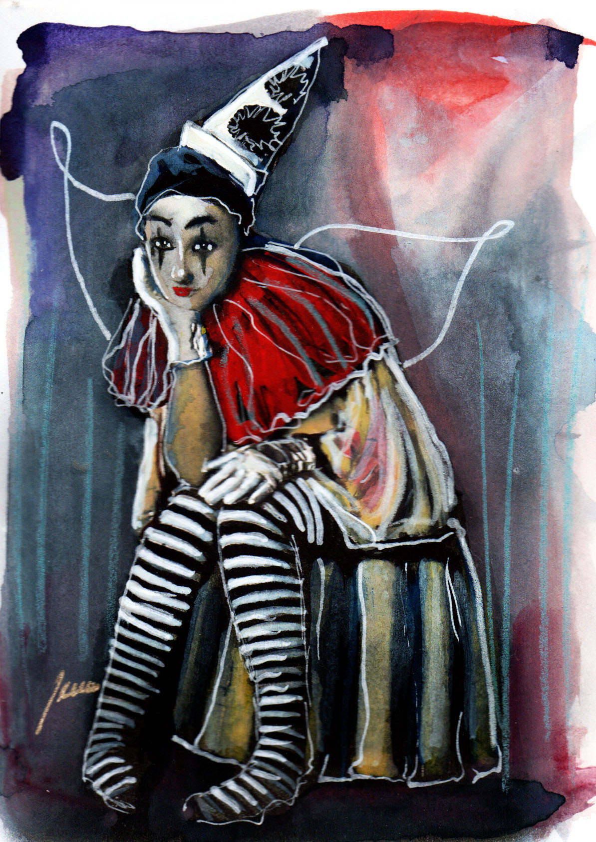 Na środku siedzi pierrot, zgarbiony, w paskowanych pończochach i czerwonej pelerynie, podpiera policzek jakby zmęczony całą sceną. Tło rozlewa się akwarelowo w granaty, fiolety i róż, z białymi smugami, które wiją się jak sznurek. Kompozycja pionowa, ciemna u dołu, rozjaśnia się u góry i naprawde podbija twarz oświetloną jak reflektorem. Kontury są obrysowane tuszem, miejsca światła podbite gwaszem, czasem nieco krzywe, ale celowo. Widać szybkie pociągnięcia, mokre na mokrym, i grubsze linie, które trzymają figurę w ryzach. Atmosfera jest cicha, troche zaplecze sceny, trochę melancholy. Ten pajac jest smutny i ma śmieszny kapelusz. Czuję w nim przerwę w śmiechu, taki moment kiedy po numerze zostaje echo i oddech. Styl balansuje między ilustracją a ekspresją, retro, a jednak tu i teraz.