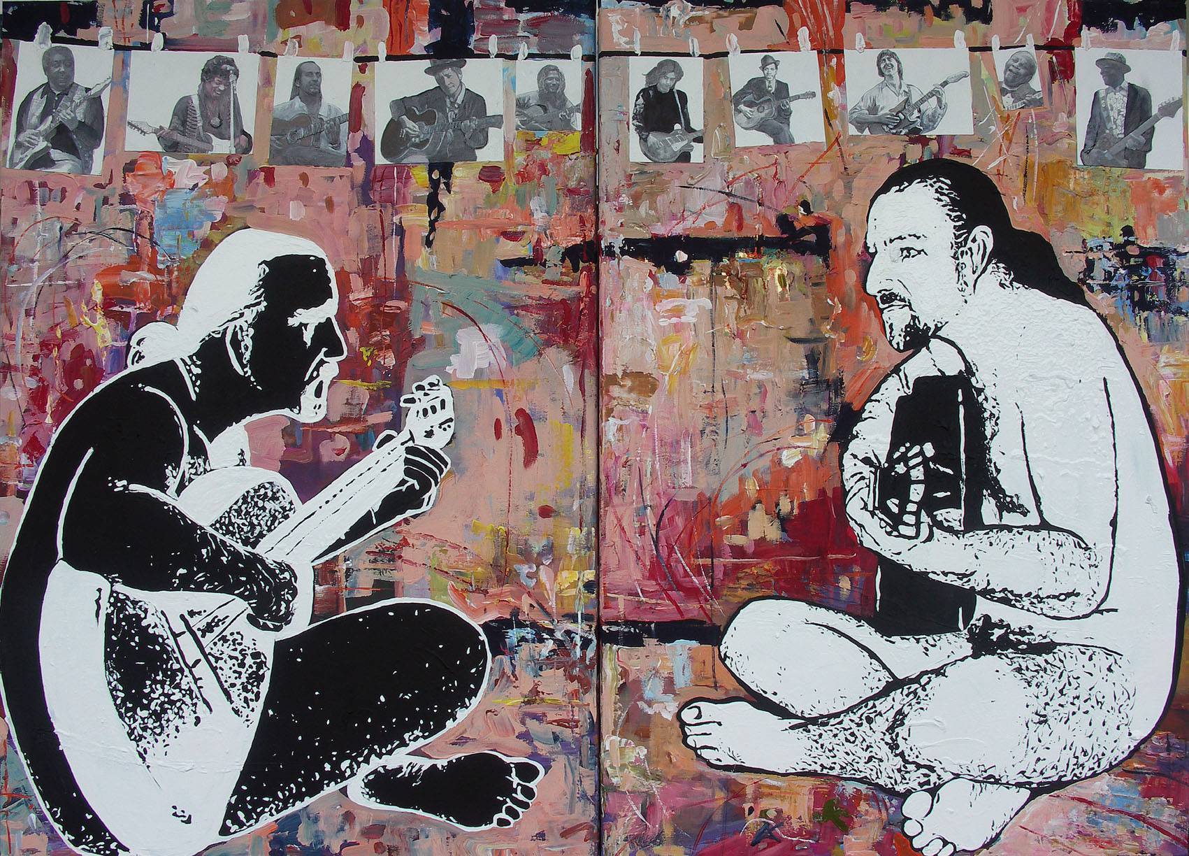 Na tym dynamicznym obrazie widać dwie figury siedzące naprzeciwko siebie, zanurzone w świecie muzyki. Postacie są kontrastowo przedstawione w bieli i czerni, wyróżniają się na tle pełnym kolorowych plam. Dominują czerwienie, różne odcienie beżu i brązu. Kompozycja jest żywa i pełna ekspresji. Atmosfera tchnie skupieniem, jakby obie osoby prowadziły cichą konwersację za pomocą gitar. Aranżacja przypomina street art, z domieszką spontaniczności i chaosu. W sercu obrazu bije rytm codzienności, łącząc czarno-biały minimalizm z kolorowym rozedrganiem tła. Technika malarska zdradza swobodę ruchów artysty, może nawet odrobinę szaleństwa. Widok ten wywołuje refleksję nad połączeniem sztuki i muzyki, przypomina o wspólnocie i emocjach, jakie potrafi wzbudzić muzyka. Niebo jest niebieskie, a gitary mają magiczną moc! Patrząc na ten obraz można poczuć delikatny dreszcz nostalgii za ulotną chwilą. What a vibe! Personalnie, czuję w nim ukrytą siłę melodi, która niesie z sobą opowieść. To jakby oglądać dwa światy, które spotykają się w jednym miejscu.