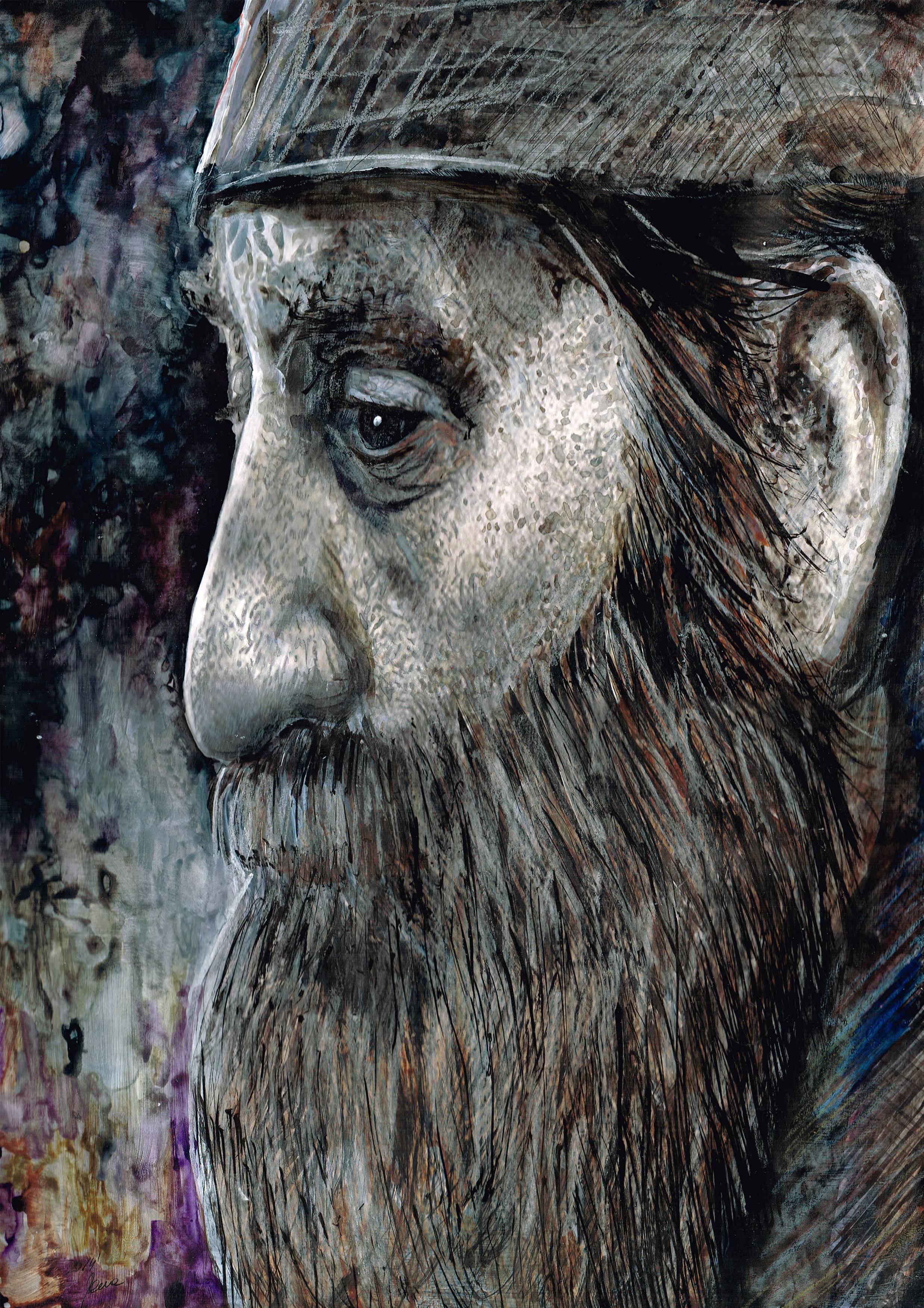 Obraz przedstawia zarys twarzy starszego człowieka, ukazany z profilu. Dominują ciemne, ziemiste barwy – głęboka zieleń, brązy z odcieniami szarości. Faktura przypomina pociągnięcia pędzla, co nadaje całości surowości i dynamiki. Twarz – pokryta zmarszczkami i brodą – emanuje spokojem, jakby skrywała tajemnicę przeszłości. Ujęcie sprawia, że widz czuje się jak świadek intymnego momentu. To jest fascynujące i trochę, jakby saying "look closer". Atmosfera jest pełna refleksji i nostalgii, przywołuje myśli o upływie czasu. Styl artystyczny nawiązuje do realistycznych portretów, ale z użyciem technik impresjonistycznych, widoczne są delikatne plamy barw, które tworzą miękkość przejść. Artysta zdaje się łapać nie tylko wizerunek, ale esencję postaci. Dzieło może wywoływać radość, melancholię, a także zadumę. Oglądający może odczuć wdzięczność za spokojny wyraz twarzy, może też dostrzec ciężar historii w oczach postaci. Dla małego dziecka mogłoby to być "dziadek z bajki", co dodaje obrazowi warstwy prostoty i uroku. Patrząc na obraz, czuję, że w nim jest coś z magicznego momentu ciszy przed porankiem. Każdy szczegół wydaje się przemyślany, nawet drobne kreseczki brody. Można zachwycać się różnorodnością detali – to jest piękne w swojej złożoności i w prostocie zarazem.