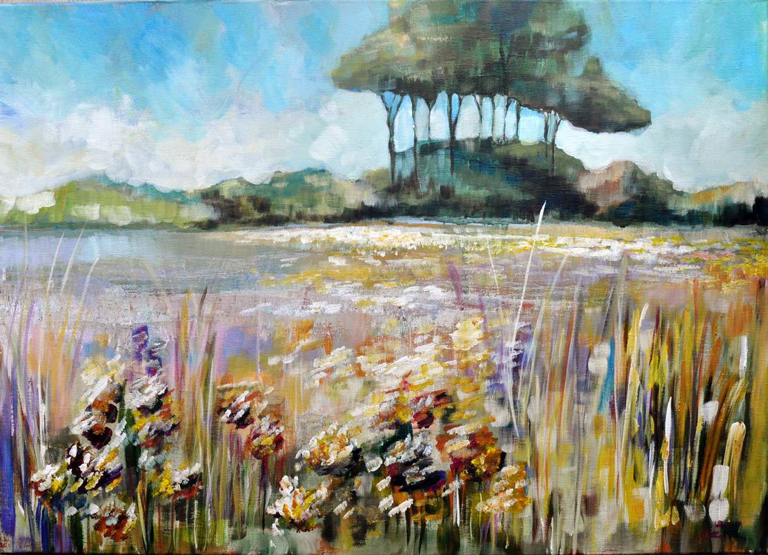 Malowany pejzaż przyciąga wzrok delikatnymi plamami kolorów, które zdają się szeptać historie natury. Na pierwszym planie kwiaty i trawy wirują w wietrze, układając się w rozmyty kalejdoskop odcieni – bieli, żółci, fiołków. Niemal czuć zapach łąki. W tle drzewa, niczym zielone baobaby, wznoszą się na wzgórzu, a nad nimi bezkresne niebo o odcieniach błękitu. Jak płynna akwarela, niebo zlewa się z chmurami, tworząc uczucie spokoju i magicznej przestrzeni. Nastrój obrazu balansuje między sielanką a nostalgią za nieosiągalnym rajem. Artysta wykorzystał technikę impastu, co wprowadza fakturę i dynamikę. Pociągnięcia pędzla wydają się lekkie, niemal przypadkowe, ale każda plama ma swoje miejsce, przemyślane i celowe. Obraz jest jak „drzwi” do spokojnego świata, w którym czas płynie wolniej. Patrząc na niego, można poczuć zapomnienie codzienności. Dzieciak na pewno by zauważył: „Te kwiaty są jak z kreskówki, takie śmieszne!” I właśnie tak - ten magiczny świat przenosi nas na wyżyny wyobraźni. Magic, skoro trzeba po angielsku. Co za cudny kawałek natury na płótnie!