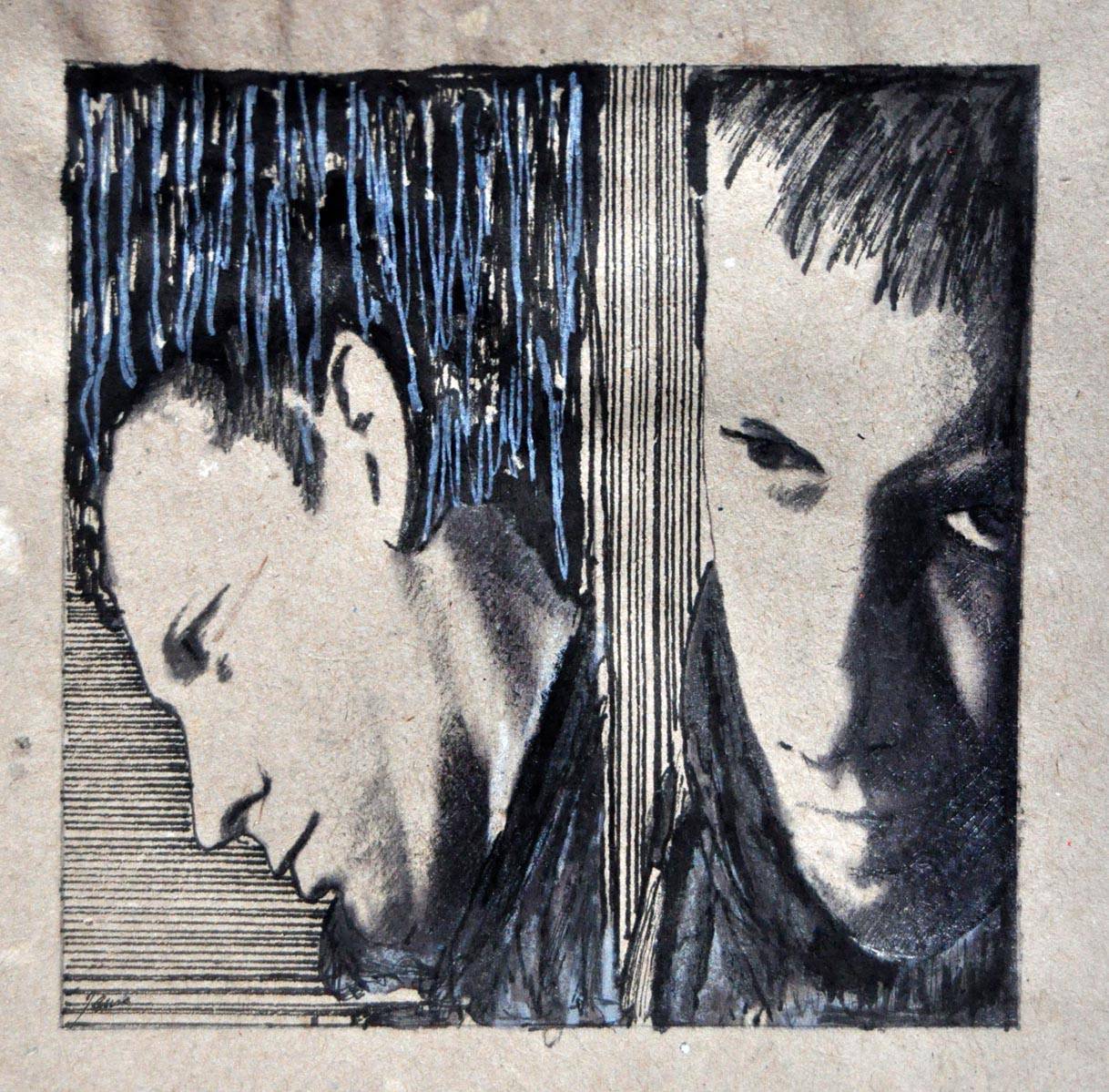 Na obrazie widnieją dwie twarze, przedstawione w kontrastujących pozach. Kolory są stonowane, dominują szarości i czernie, a subtelne akcenty niebieskiego ożywiają kompozycję. Przebiegające pionowo kreski przypominają deszcze, nadając dziełu ciekawej głębi. Jest coś magicznego w tym, jak artysta uchwycił nastrój. Styl jest surowy, niemal ekspresjonistyczny, co buduje atmosferę tajemniczości i lekkiego niepokoju. Użycie intensywnego światło-cienia dodaje dramatyzmu. Obraz emanuje melancholią. Pierwsza twarz pochyla się w zamyśleniu, bije z niej smutek, druga spogląda intensywnie, niemal przenikliwie. Prace toczy się jakiegoś rodzaju wewnętrzny dialog. Patrząc na to, czuję nostalgię za utraconym czasem. Czy kiedyś myślałeś o tym, "co by było gdyby"? To dzieło przypomniało mi właśnie o tych chwilach. Styl artysty jest niezwykle emocjonalny. Każda kreska zdaje się mieć swoje znaczenie, jakby artysta prowadził widza przez labirynt emocji. Co ciekawe, technika tuszu i akwareli tworzy wrażenie dynamicznych ruchów, jakby wodospad na powierzchni papieru. "Wow, to jak deszcz na papierze" powiedziałoby 7-letnie dziecko. Artysta wspaniale pokazuje, jak subtelność koloru potrafi potęgować emocje dzieła.