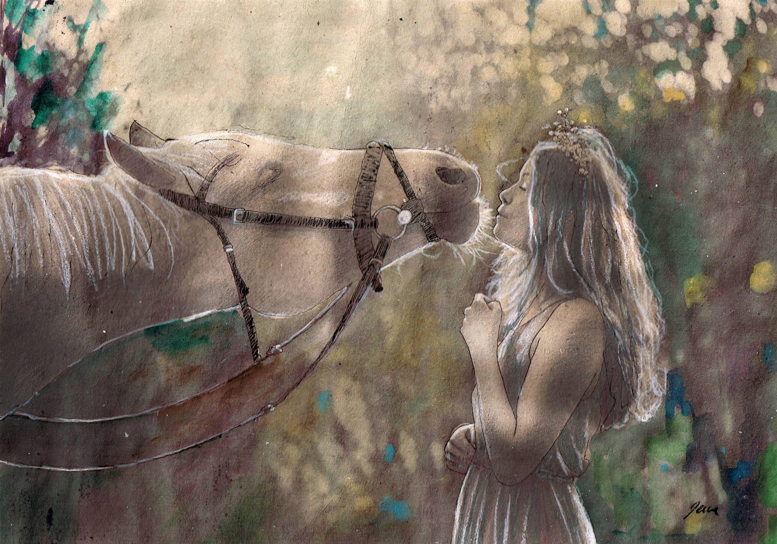 Obraz przedstawia subtelną scenę, na której kobieta z delikatnym uśmiechem zbliża się do konia. Kolory są stonowane, dominują beże, zielenie i przyciemnione odcienie brązu. Kształty są łagodne, wiejący wiatr łagodnie rozwiewa włosy kobiety, a światło zmienia się w złotą mgiełkę w tle. Kompozycja przywodzi na myśl harmonię natury i czułość relacji między człowiekiem a zwierzęciem. Atmosfera obrazu jest ciepła i pełna pokoju, jakby zatrzymany w czasie moment wzajemnej zrozumienia. Artysta zastosował techniki przypominające akwarelę, z lekkimi pociągnięciami, które dodają delikatności i eteryczności. Emocje, które obraz wywołuje, to spokój, nostalgia i delikatne wzruszenie. Widz może wyobrazić sobie szum liści i miękkie rżenie konia. Obraz może wywołać refleksje nad prostotą piękna i bliskością natury. A ja przysięgam, że czuję nutkę magii w tej chwili. Dziecko mogłoby powiedzieć: Ona szepce koniu tajemnice do ucha. Takie momenty są "magical", przypominają nam o tym, co w życiu naprawdę ważne. I może, choć nie ma wiele kolorów, ten obraz ma wiele uczuć.