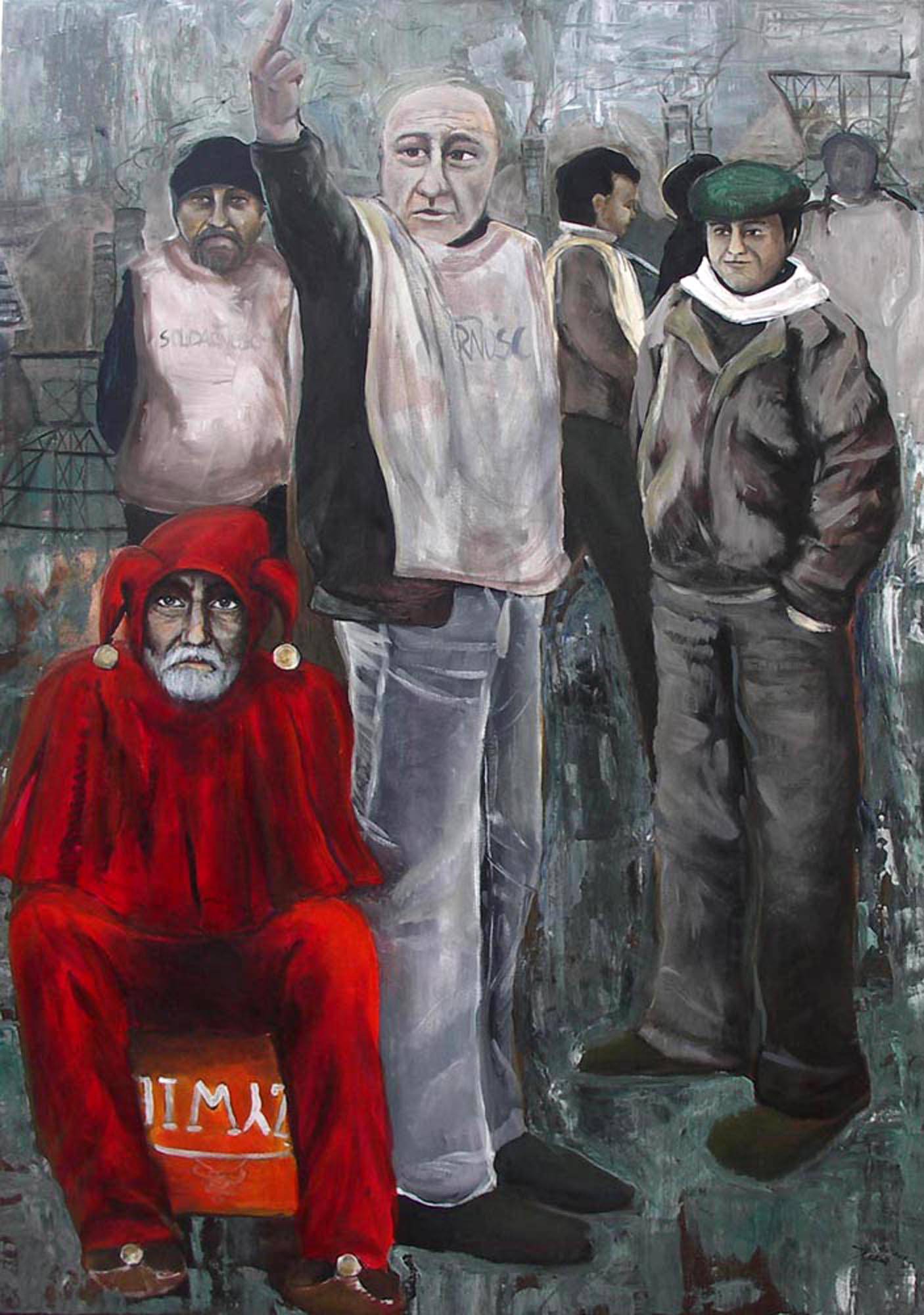 Na obrazie widzimy grupę mężczyzn, tło szare i ponure, kontrastuje z żywą czerwienią stroju jednej z postaci. Jego wyrazista twarz skupia uwagę, jakby mówił "spójrz!". Gdy patrzę na ten obraz, czuję ciężar historii. Każda twarz jest jak księga pełna przeżyć. Emocje emanują ze stłumionych barw i surowych pociągnięć pędzla. Można wyczuć nutkę determinacji, może nawet buntu. Styl jest malarski, impresjonistyczny, z nutką ekspresjonizmu w sposobie ukazania emocji. Kompozycja jest gęsta, a postaci wydają się wyrastać z tła, co dodaje dynamiki. Atmosfera jest melancholijna, a zarazem pełna nadziei. A ten gość w czerwonym kapturze - jak z bajki, prawda? Może to symbol kontrastu między marzeniami a rzeczywistością. Myślę, że artysta chciał pokazać coś więcej niż zwykły obraz. To jak zatrzymana chwila, stop-klatka z życia. Podejrzewam, że wielu widzów może poczuć melancholię. Obraz prowokuje, zachęca do zatrzymania się i refleksji. Czy to nostalgia za utraconymi czasami? A może nadzieja na lepsze jutro? Jedno jest pewne, ten obraz mówi więcej niż tysiąc słów. To jak "echo" czasów, które dawniej były pełne niepewności.