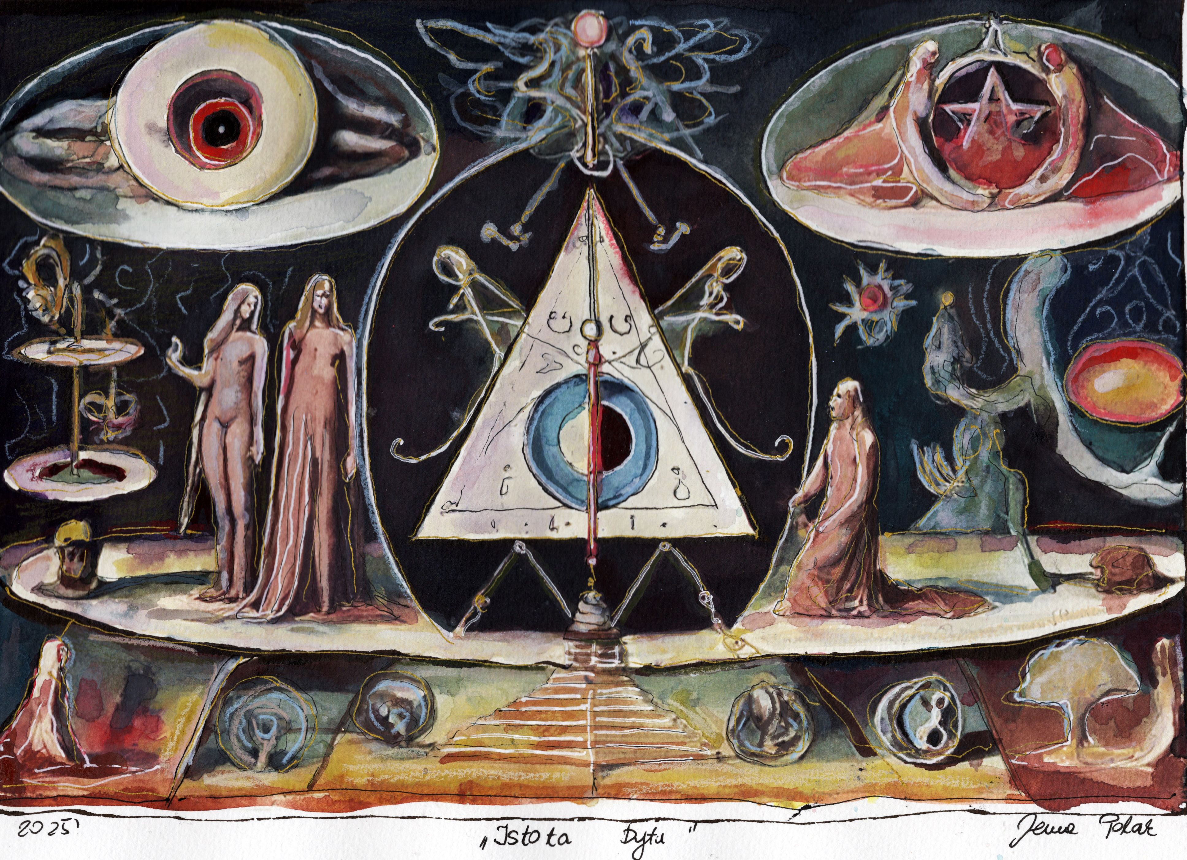 Obraz emanuje mistyczną atmosferą, jakby przenosił nas do świata snów. Dominują tu ciemne tony czerni i granatu, przełamane ciepłymi barwami czerwieni i złota. Na pierwszy plan wysuwają się dwie postacie w długich, zwiewnych szatach, stojące pośród geometrycznych kształtów przypominających odwrotną piramidę z tajemniczymi symbolami. Centralnie umieszczone wielkie oko zdaje się spoglądać w głąb duszy. Halo tego obrazu sprawia wrażenie nieziemskiego spokoju, ale i pewnej dozy niepokoju. Styl jest surrealistyczny, podobny do Dalí'ego, jednak z unikalnym twistem. Technika akwareli daje efekt delikatności, jakby wszystko to mogło zniknąć przy jednym muśnięciu pędzla. Patrząc na obraz, można poczuć dreszcz emocji i refleksji nad istotą bytu. Myśli krążą wokół zagadek wszechświata, a jedno z prostych skojarzeń brzmi: "Ojej, to wygląda jak magia!". For a moment, you're lost in this captivating dreamscape. To dzieło zmusza do myślenia, do zastanowienia się nad symboliką życia i bytu. Każdy detal przyciąga uwagę, każda figura ma swoje znaczenie, pozostawiając widza z mnóstwem pytań i refleksji. Czy to po prostu obraz, czy może brama do innego wymiaru?