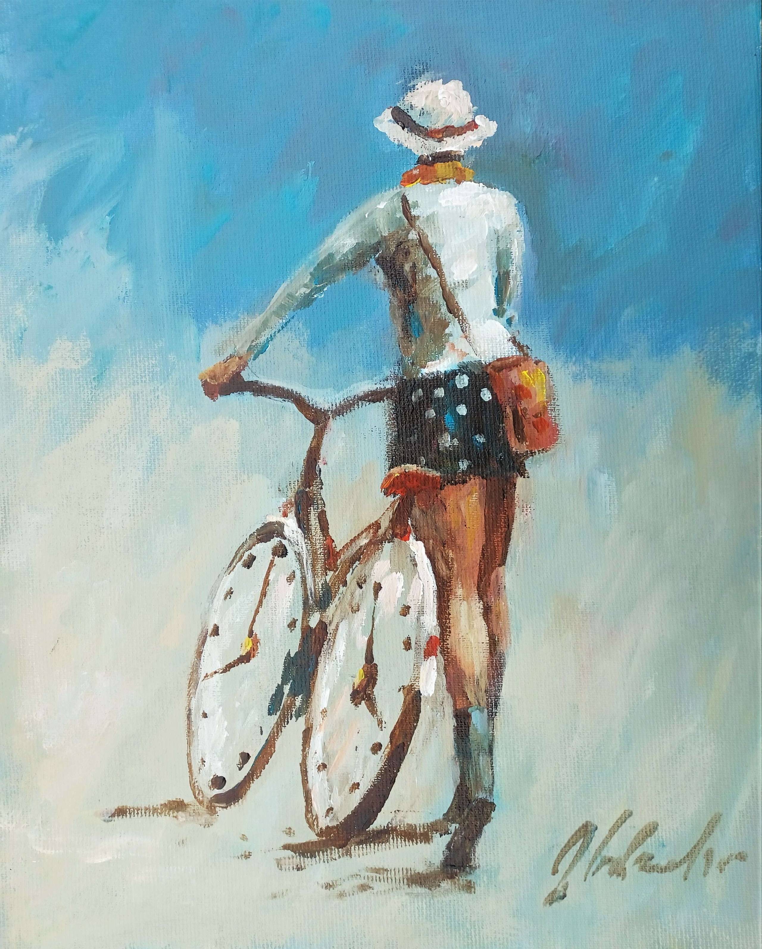 Obraz przyciąga wzrok swoją delikatną paletą błękitów i beżów, które tworzą lekki, niemal senny nastrój. Postać w kapeluszu z nonszalancją prowadzi rower, którego koła przypominają tarcze zegarów, co dodaje surrealizmu. Kształty są miękkie, a kompozycja sprawia wrażenie uchwyconego momentu w czasie, jakbyśmy podglądali czyjąś prywatną chwilę zadumy. Technika artysty jest swobodna, a przecierki farby tworzą teksturę, która mówi o upływie czasu. Obraz wywołuje uczucie nostalgii, może trochę tęsknoty za beztroskimi dniami. Może nawet poczujesz, jakbyś sam spacerował po piaszczystej drodze wzdłuż nadmorskiej scenerii. Emocje wibrują niczym echo starych wspomnień, "freedom" to słowo, które dosłownie unosi się w powietrzu. Dzieciaki pewnie by krzyknęły: "Wow, patrz, ten rower ma zegary zamiast kół!". To świetny przykład sztuki, która miesza codzienność z odrobiną fantazji. Przyglądając się dłużej, można poczuć ciepło promieni słonecznych na ramieniu, a może nawet usłyszeć szum fal. I choć to tylko obraz, to czujesz, jakbyś był tam osobiście.