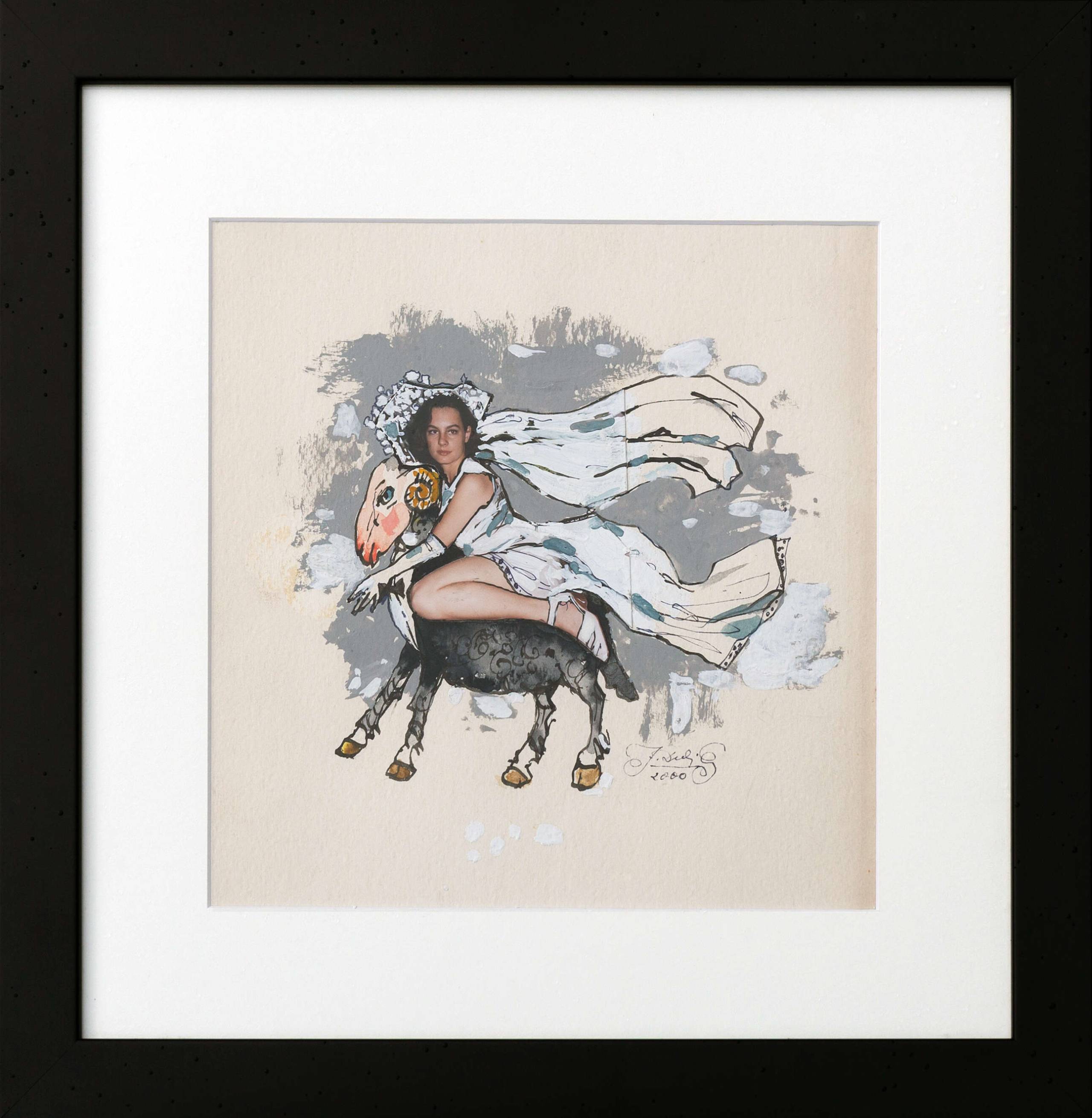 "bez tytułu", kolaż, akwarela i tusz na papierze, wymiary 30x25cm (w ramie około 39x39 cm) Na obrazie znajduje się postać kobiety ubranej w strój przypominający suknię z długim welonem, co może kojarzyć się z tematyką ślubną. Kobieta siedzi na rycersko przedstawionym, stylizowanym zwierzęciu o ludzkiej twarzy z charakterystycznymi elementami, takimi jak krzykliwie czerwony pysk i duże oczy. Zwierzę ma zaledwie kilka charakterystycznych cech, które nadają mu fantastyczny wygląd, jak ciemne ciało z krótkimi nogami. Cała scena jest utrzymana w stonowanej kolorystyce z dominacją odcieni szarości i bieli, z lekkimi akcentami kolorystycznymi. Tło jest skromnie pomalowane, odwołując się do abstrakcyjnych motywów, co dodaje dziełu surrealistycznego charakteru. Kompozycja łączy w sobie nowoczesne techniki artystyczne z klasycznymi elementami, co może prowokować do refleksji nad symboliką całości. Całość jest oprawiona w czarną ramę z białym passe-partout, co efektownie eksponuje dzieło.