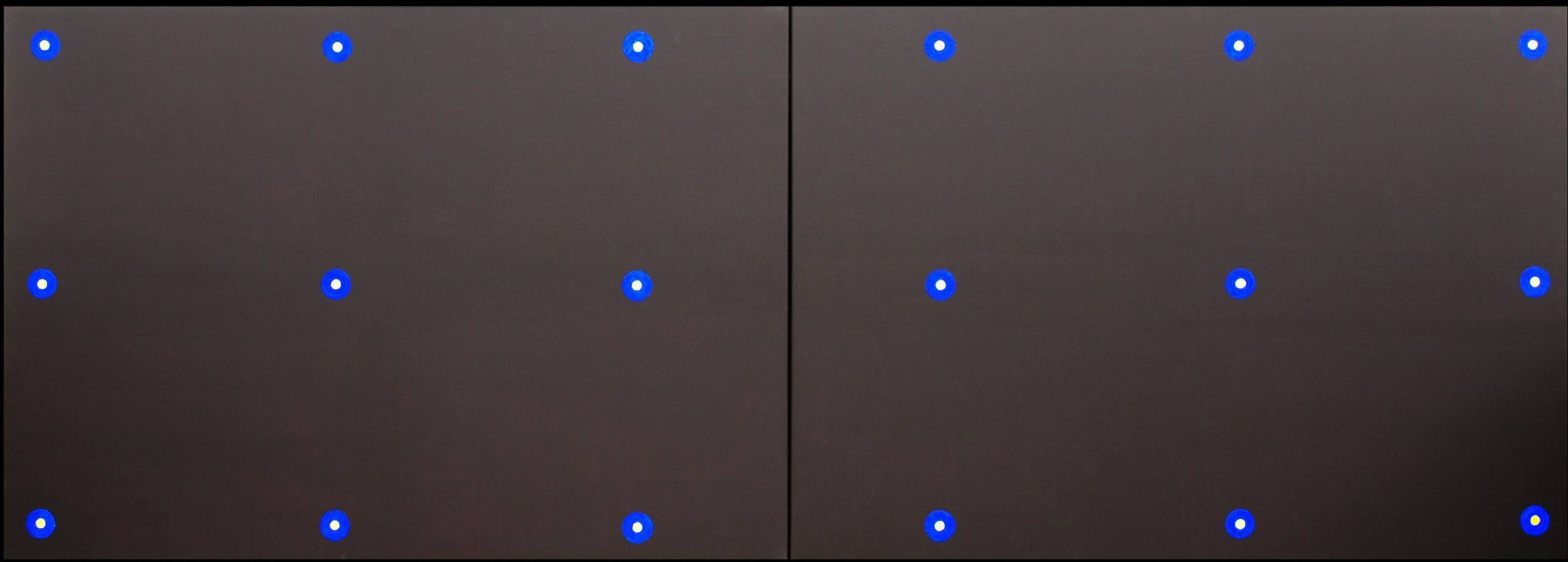 Na obrazie widzimy minimalistyczną kompozycję, składającą się z regularnie rozmieszczonych niebieskich kropek na ciemnym, niemal czarnym tle. Każda kropka jest precyzyjnie wycentrowana, tworząc harmonijny wzór. Kolor niebieski w zestawieniu z tłem przyciąga wzrok, wprowadzając spokój i równowagę. Atmosfera obrazu jest tajemnicza, niemal medytacyjna. Można by rzec, że to taka "midnight calm". Artysta zastosował technikę geometrycznego minimalizmu, skupiając się na prostocie formy i kolorów. Dzięki temu odbiorca może zanurzyć się w refleksji, odnajdując w prostocie nowe znaczenia. Kropki, choć powtarzalne, każda z nich zdaje się opowiadać własną, cichą historię. Ten obraz to jakby patrzeć w gwiazdy na niebie. To właśnie ten moment, gdy prostota staje się głęboka. Naprawdę warto chwilę się zatrzymać i popatrzeć. Jak u 7-latka to mogłoby brzmieć: ale czadowe kropeczki na czarnym! Widzisz, jak niewiele potrzeba, by coś tak prostego stało się tak intrygujące? Te regularne, niemal matematyczne wzory budzą uczucie zen. Dla mnie to taka wizualna medytacja. Fascynujące!