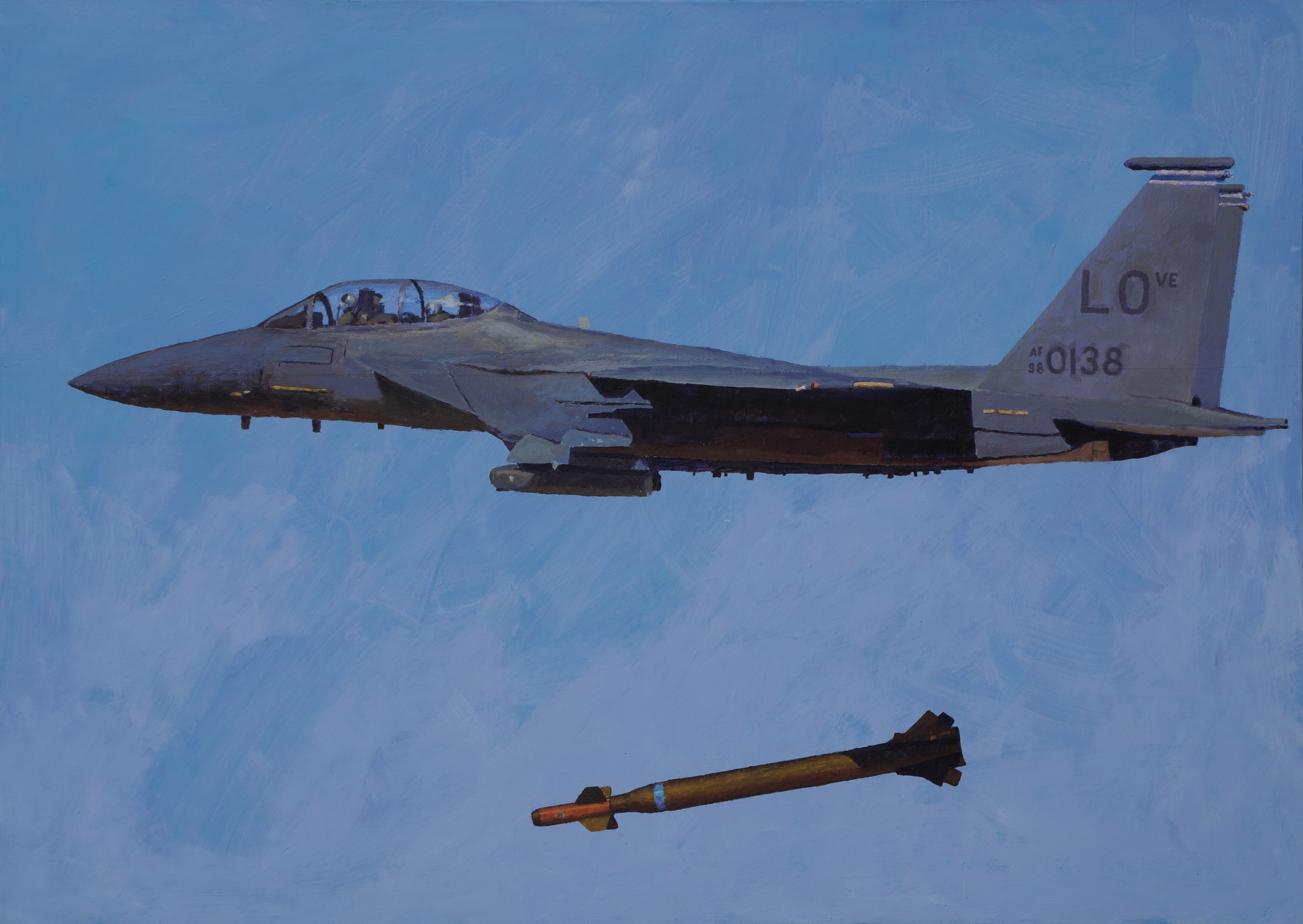 Na błękitnym, jednolitym tle sunie szary myśliwiec, bryła o ostrym nosie i szerokich skrzydłach, namalowana szerokimi, matowymi pociagnieciami. Pod spodem spada smukła bomba, pomarańczowo rdzawa, tworząc przekątną kierującą wzrok w dół. Kompozycja oszczędna, prawie plakatowa, dominuje chłodna gama i twardy kontrast światła z cieniem. W kabinie błyska szkło, bez detalu, jakby celowo. Słychać w głowie ten suchy szum power. Czuję napięcie, troche niepokój i dziwną ciszę przed uderzeniem. Dziecko by powiedziało tak. Samolot leci i zrzuca coś. Pociągnięcia pędzla widoczne, miejscami niby niedomalowane, co sugeruje akryl albo olej kładzony szybko. Styl półrealistyczny, chłodny, z dystansem. Na stateczniku litery układają się w LOVE, ironiczny drobiazg, który gryzie sumienie. To komentarz do techniki, która uwodzi formą, a w środku niesie przemoc. Ja mam mieszane uczucia, bo jednocześnie patrzę z zachwytem i wstydem, no i tak już zostaje.