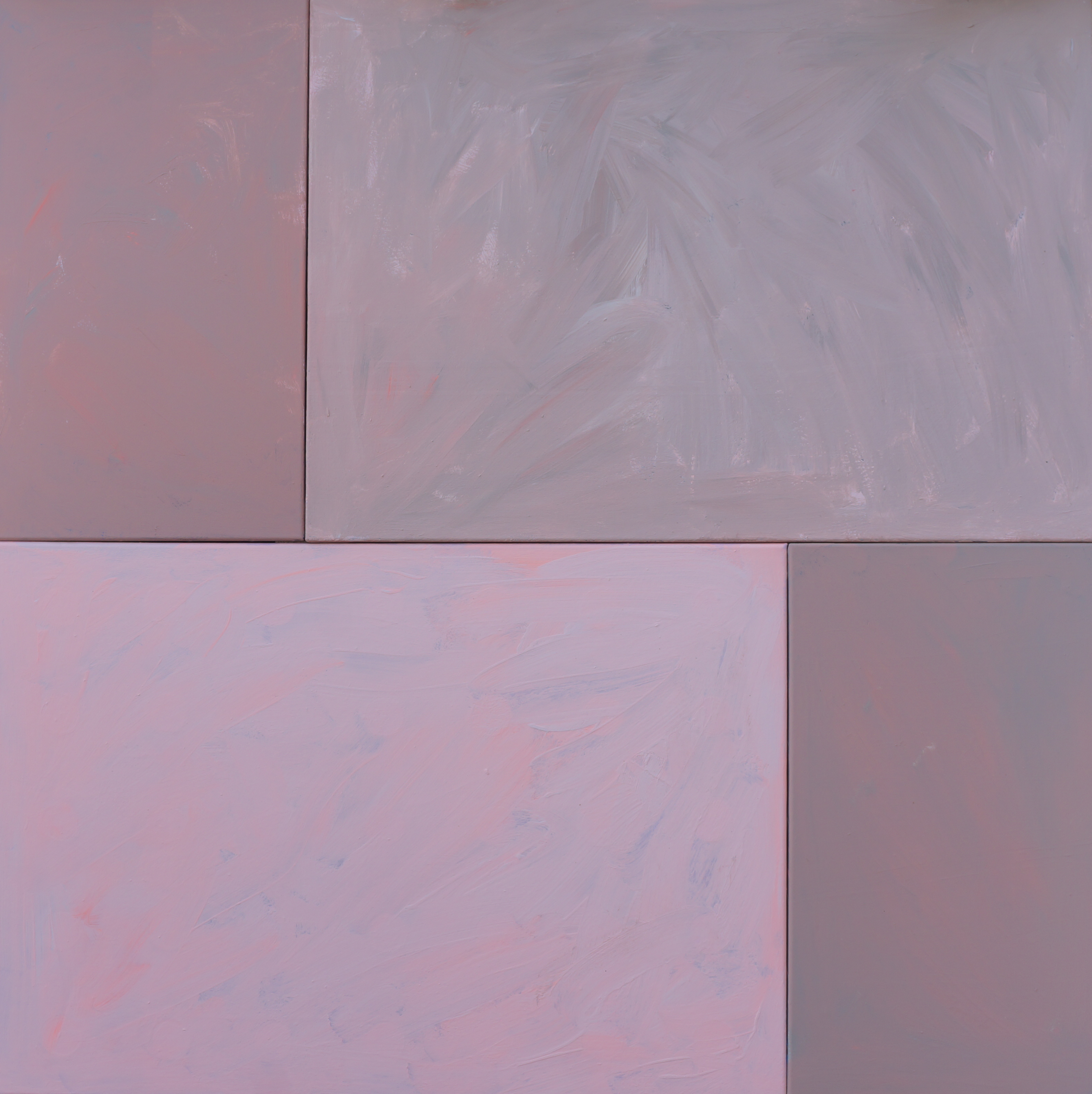 Cztery prostokąty układają się w spokojną mozaikę, oddzielone cienkimi liniami jak lekko przesunięte płyty. Paleta blednie ku lawendzie, pudrowemu różowi i mglistym szarościom, widać wachlarzowe pociągnięcia i przetarcia, warstwowe akryl i chwilami suchy pędzel. Atmosfera jest cicha jak przed świtem, trochę melancholijna. Lubię ten róż bo jest jak chmurka. Tak serio to minimalizm spotyka subtelny ekspresjonizm i to działa, choć niby nic tu sie nie dzieje. Czuję spokój, ale też cichą tęsknotę pod skórą. Dla mnie to okna na własne myśli albo puzzle z ciszy. Naprawdę one są soft. Gdy dłużej patrzę, jakby słychać szept farby.