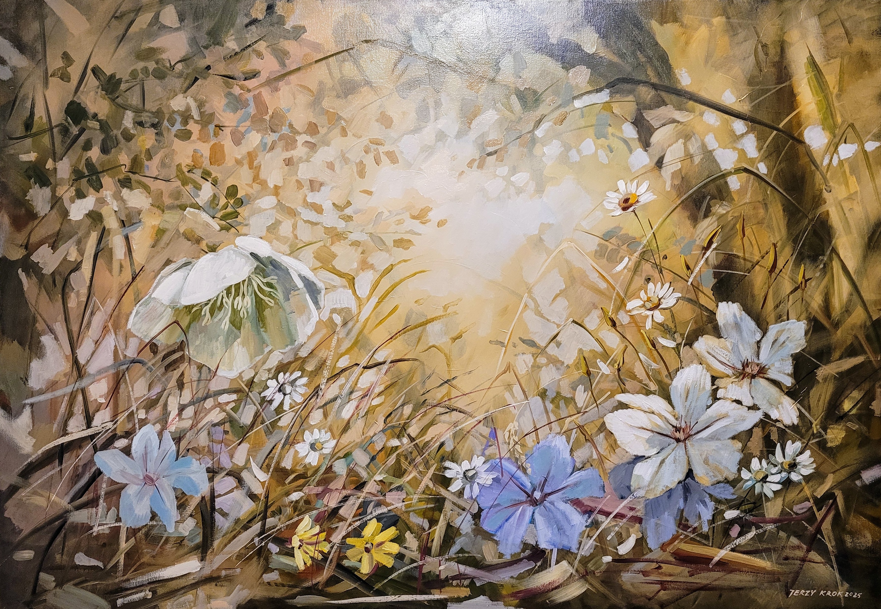Na obrazie dominuje kalejdoskop pastelowych odcieni, w którym przeważają delikatne beże i zieloności tła, kontrastujące z błękitami i bielą kwiatów. Kompozycja jest harmonijna, z wyraźnie zaznaczoną perspektywą. Kwiaty są jakby porozrzucane przypadkowo, lecz w tej przypadkowości widać przemyślaną kompozycję. Atmosfera bijąca z obrazu jest sielankowa, przypomina leniwe, letnie popołudnie. Czuć jak ciepły wiatr delikatnie szumi wśród liści. Technika artystyczna użyta przez malarza to subtelne pociągnięcia pędzla, które tworzą delikatny efekt impresjonistyczny. Obraz przywodzi na myśl delikatność i kruchość natury. Dzieciak by powiedział: „Kwiaty w życiu są jak marzenia, piękne i ulotne!” Na widok tego obrazu, u wielu osób może pojawić się uśmiech na twarzy, przypominając im o beztroskich chwilach w ogrodzie. Jest w tym coś takiego, że one's soul feels peaceful i w harmonii. Cóż, kto by pomyślał, że kilkanaście plam farby ożywi wspomnienia i uczucia. Ale tak to już chyba bywa z prawdziwą sztuką.