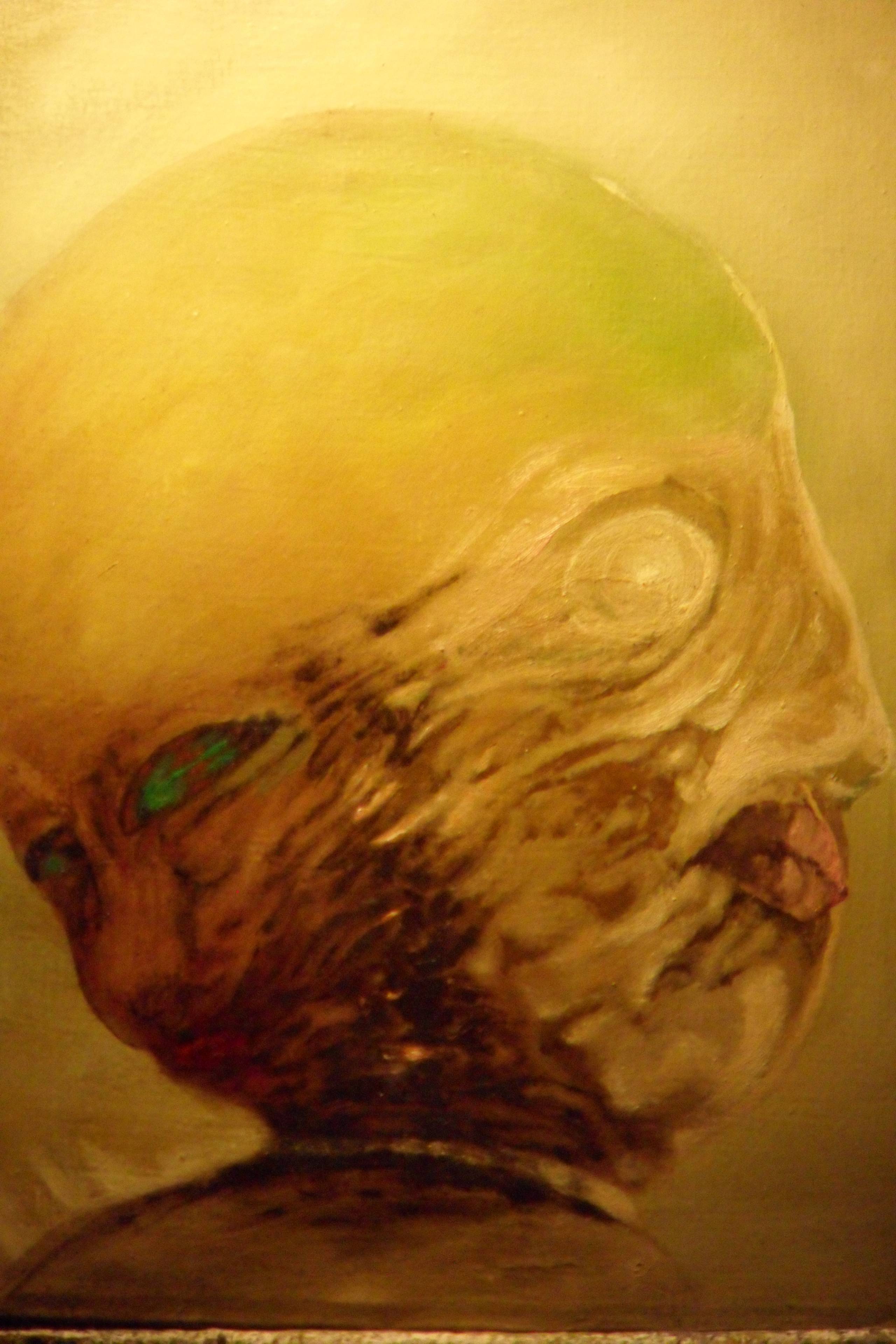 Obraz przyciąga wzrok swoimi ziemistymi odcieniami, gdzie dominuje ciepła paleta żółci, zieleni i brązów. Centralnym punktem jest niezwykła postać o niezwykłym, nieco surrealistycznym wyglądzie. Jej głowa zdaje się być uformowana z subtelnych plam i pociągnięć pędzla, co nadaje jej organiczny i nierealny wyraz. Kompozycja jest skupiona na tej postaci, podczas gdy tło pozostaje delikatne i zamazane, co dodaje obrazowi głębi. Nastrój emanujący z tego dzieła jest nieco niepokojący, ale jednocześnie fascynujący. Czujesz, że wpatrujesz się w coś z innego świata, coś nie do końca uchwytnego. Wybór kolorów i kształtów podkreśla tajemniczość i pewną melancholię. Styl jest oniryczny, może nawet trochę w stylu dreamlike art, gdzie granice między rzeczywistością a snem się zacierają. Technika użyta przez artystę wydaje się być mieszanką impresjonizmu z nutką surrealizmu. Pociągnięcia pędzla są miękkie, niemalże płynne, co dodaje całości harmonii i płynności. Obraz wywołuje w odbiorcy mieszane uczucia. Z jednej strony niepokój, z drugiej ciekawość. Co przedstawia ta niecodzienna twarz? Czy to maska emocji, czy raczej odbicie wewnętrznego świata? "Dlaczego ten pan ma dziwną twarz?" zapytałoby dziecko. Może postać wywołać refleksję nad ludzką naturą, ulotnością formy i tajemnicami, jakie skrywamy wewnątrz. Kiedy patrzę na ten obraz, czuję się przyciągany przez jego niecodzienny urok. Czy to piękno czy coś zupełnie innego?