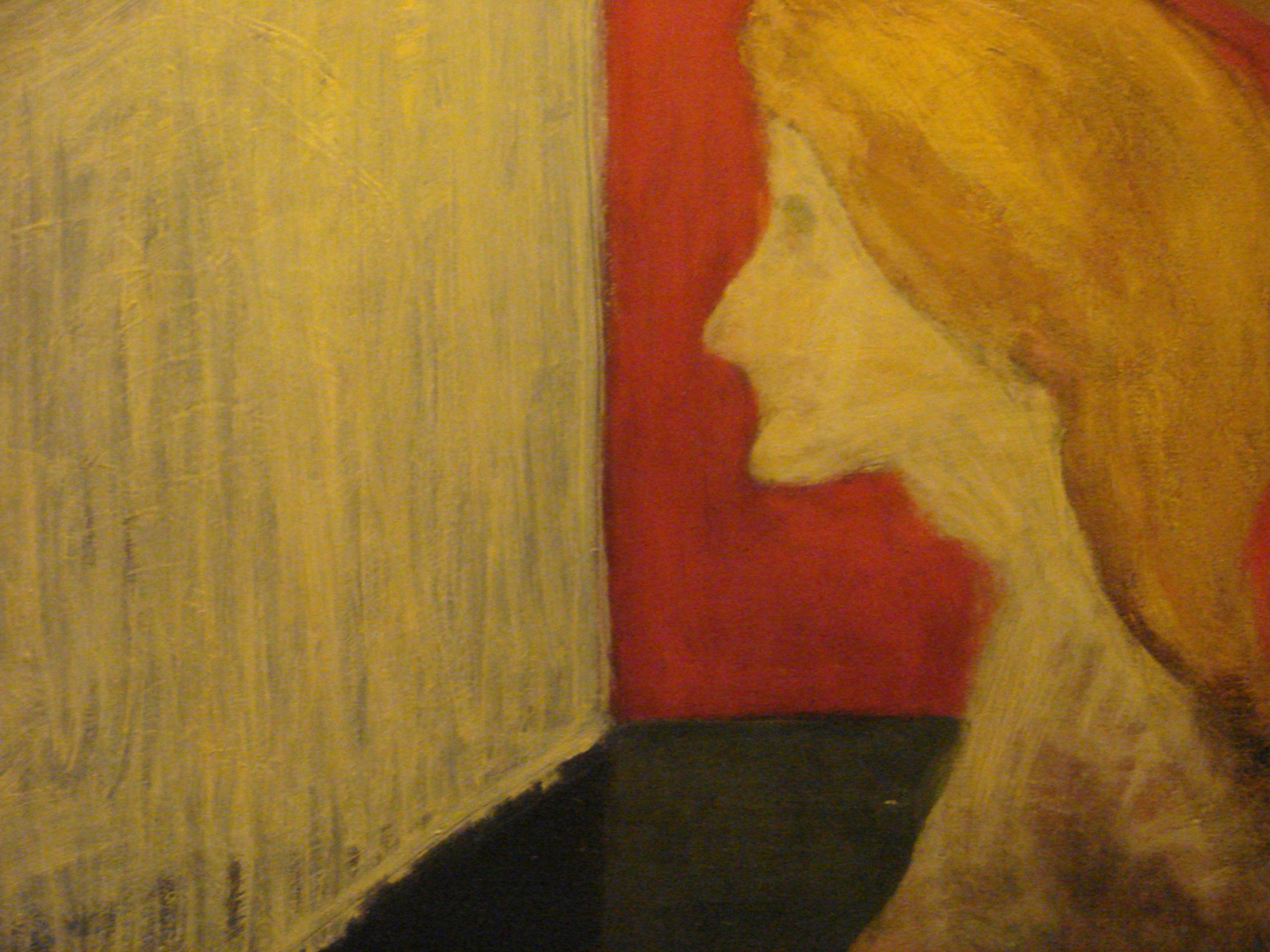 Na obrazie dominują ciepłe, złotawe odcienie kontrastujące z głęboką czerwienią. Postać z profilu jest szkicowo zaznaczona, jej twarz jakby stapia się z tłem; wydaje się nieco nierealna. Tło to duża płaszczyzna w neutralnym, jasnym kolorze, które zdaje się wchłaniać postać. Kompozycja jest prosta, ale zarazem intrygująca, przyciąga wzrok. Atmospheric vibe obrazu jest melancholijny, jakby czas stanął w miejscu. Artysta zastosował technikę impastu, co nadaje fakturę i głębię dziełu. Obraz może wywoływać różne emocje: spokój, refleksję, a może nawet lekki niepokój przez swoją oszczędność w detalach. Kiedy na niego patrzę, czuję jakbym zaglądał do czyjegoś wnętrza, to takie dziwne uczucie. Może to samotność w tłumie? Dla małego dziecka obraz mógłby przedstawiać zamek albo tajemniczą postać z baśni. To dzieło artystyczne ma w sobie coś zarówno nowoczesnego, jak i ponadczasowego, łącząc prostotę z głęboką metaforą. Kto tu mieszka? Pisząc te słowa, nie mogę oprzeć się wrażeniu, że obraz kryje w sobie więcej, niż widać na pierwszy rzut oka; to trochę jak czytanie między wierszami.