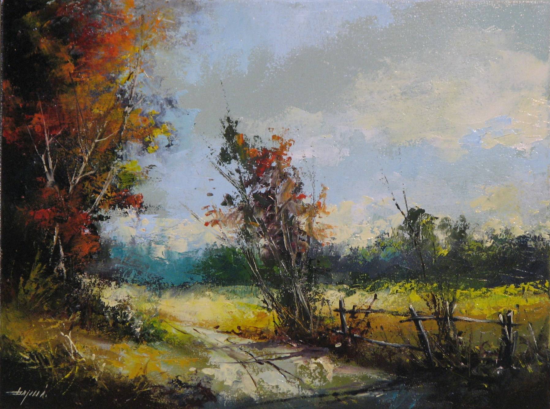 Na obrazie widzimy malowniczy pejzaż pełen jesiennych barw, które przenikają się niczym farby na palecie artysty. Po lewej stronie dominuje paleta ciepłych czerwieni i pomarańczy, symbolizujących zmieniającą się porę roku. Kontrastuje z tym delikatny błękit nieba, pełen rozmytych chmur, które wydają się szepcić: "tu i teraz". Kompozycja jest dynamiczna, ale jednocześnie spokoja. Drzewa, nieco pochylone, nadają całości lekki dramatyzm. Techniką impastu, artysta osiągnął efekt faktury, dodając obrazowi trójwymiarowości. Patrząc na to, czujesz, jakby czas zwalniał. Jak maluję podobne drzewko, ja też się cieszę. Całość emanuje nostalgią za przemijającym latem, wzbudzając refleksję nad cyklami natury. Wydaje się, że z każdą chwilą znajdujemy na płótnie coś nowego, a emocje? One przychodzą falami. To po prostu breathtaking.