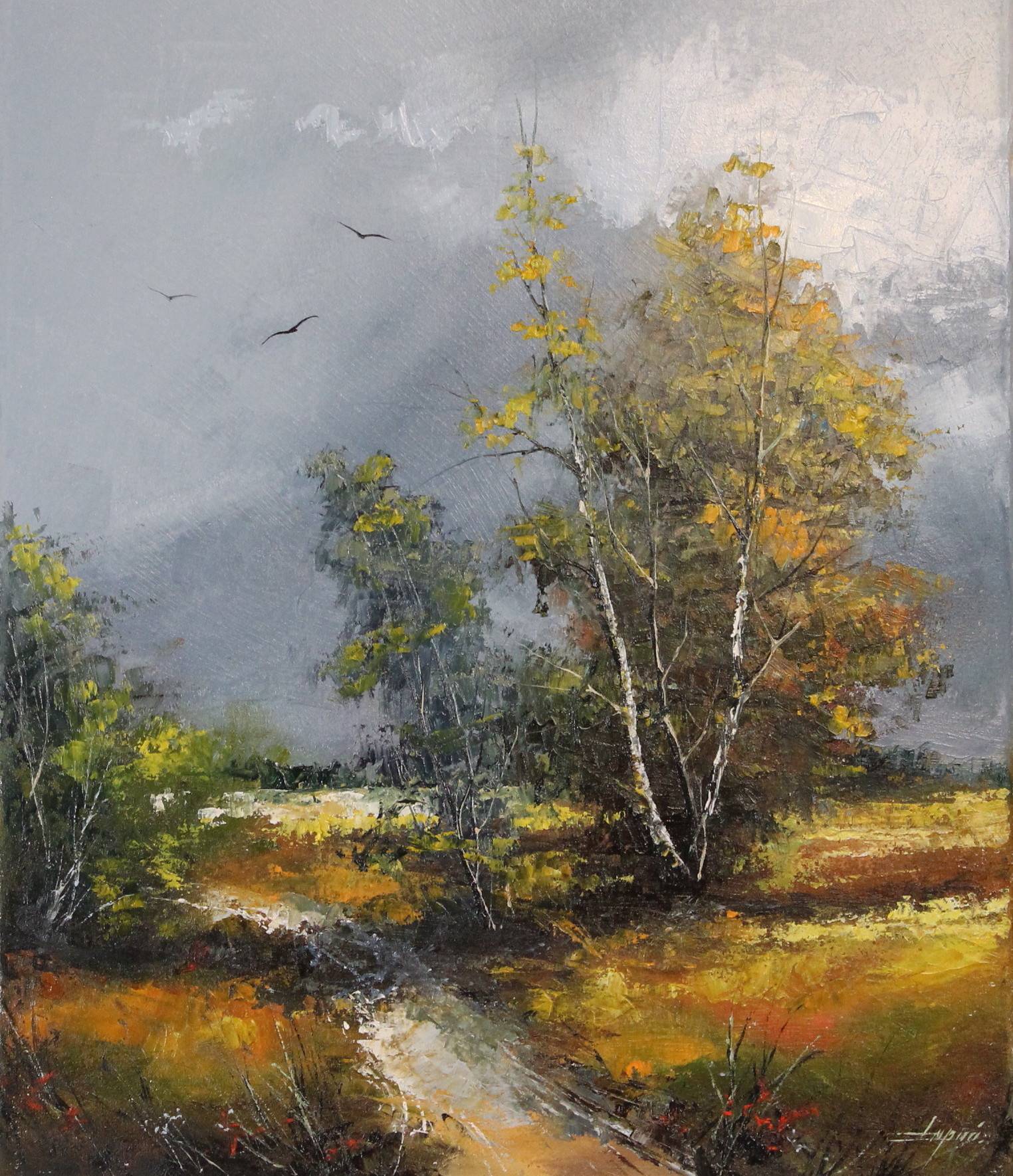 Obraz przedstawia malowniczy pejzaż, gdzie dominują odcienie szarości, zieleni i złota. Drzewa, z liśćmi przesiąkniętymi jesienną paletą, stoją po prawej stronie, tworząc przytulny zakątek. Niebo jest pokryte szarymi chmurami, co nadaje całości melancholijny nastrój. Tło zdobią ptaki, które niczym czarne sylwetki lecą w przestworzach. Kompozycja jest harmonijna, prowadzi wzrok w głąb obrazu, gdzie ścieżka wije się jak serpentyna. Czuć tu spokój, ale i lekką zadumę. Artysta zastosował technikę impastu, widoczną w grubo nałożonej farbie. Styl ma w sobie nutę impresjonizmu, co uwydatnia atmosferę obrazu. Malarska tekstura i subtelne przejścia barwne tworzą wrażenie ruchu i zmienności natury. Patrząc na obraz, można poczuć zapach mokrej ziemi po burzy. Przyglądając się dziełu, odbiorca może poczuć nostalgię za minionymi czasami. Może iść tam, gdzie ścieżka prowadzi, w swoje własne marzenia. "Look, birds!", powiedziałoby dziecko, wskazując na niebo z zachwytem. Obraz jest dla mnie pieśnią o przyrodzie i jej nieustającej transformacji. Przypomina, jak piękno trwa mimo kapryśnej pogody.