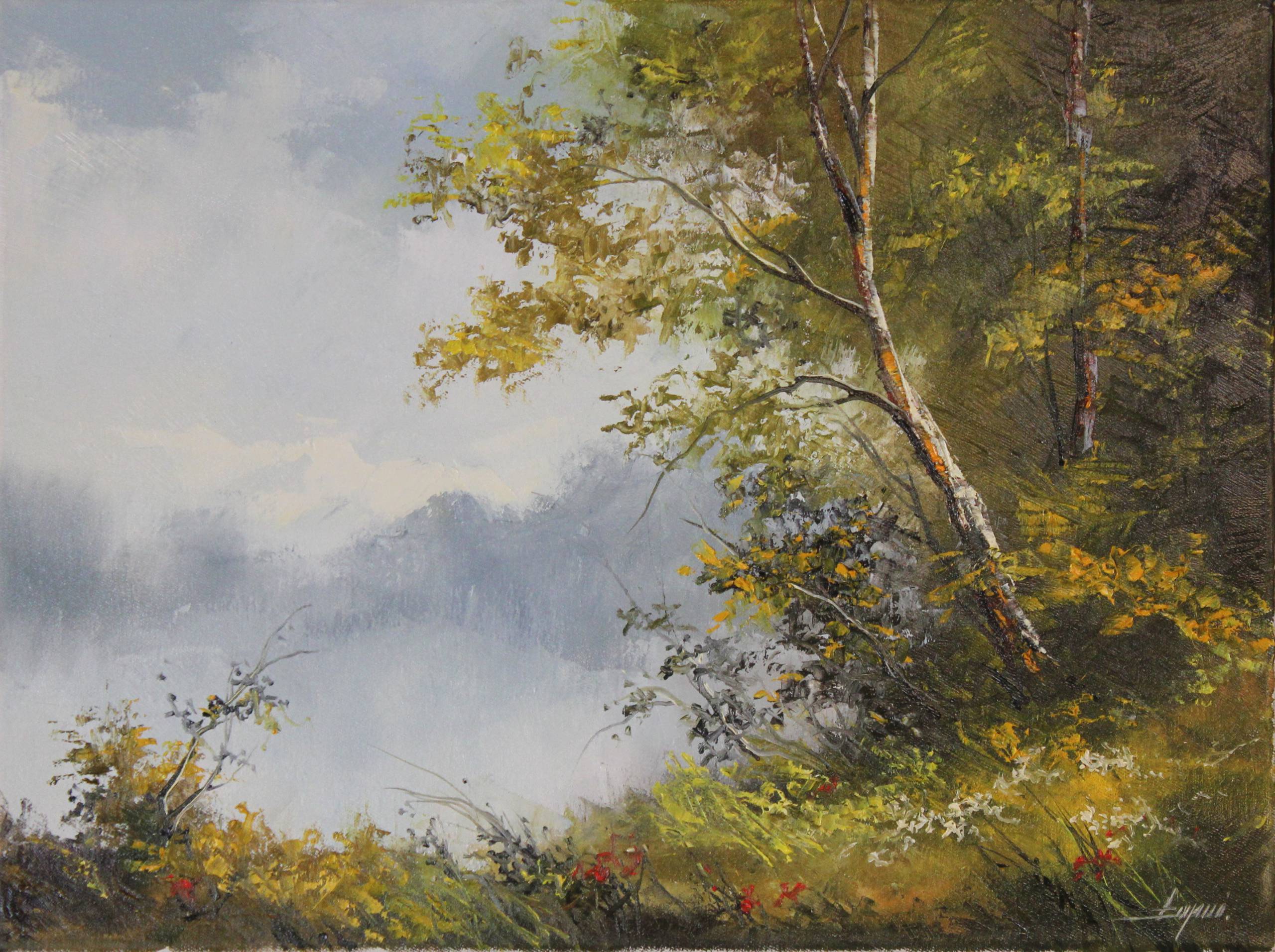 Obraz przedstawia malowniczy krajobraz z delikatnymi kolorami zieleni, żółci i błękitu, które przeważają w jego kompozycji. Drzewa po prawej stronie zdają się delikatnie kołysać na wietrze, a ich smukłe pnie kontrastują z gęstością liści. Tło rozmywa się w jasnych odcieniach nieba, tworząc wrażenie głębi. Atmosfera obrazu emanuje spokojem i harmonią, jakby czas zatrzymał się na chwilę. Artysta posłużył się techniką impasto, nakładając warstwy farby, co nadaje dziełu fakturę i dynamikę. Można niemal poczuć, jak wiatr porusza liśćmi i szum delikatnie wdziera się w umysł odbiorcy. "Wow, to las!" - mogłoby powiedzieć dziecko. Obraz ten ma magiczną zdolność przenoszenia w świat nostalgii, przypominając o letnich spacerach i chwytających za serce momentach spędzonych na łonie natury. To jeden z tych widoków, które powodują „chill” na plecach i sprawiają, że człowiek pragnie zanurzyć się w nim całkowicie. Patrząc na to dzieło, można odnieść wrażenie, jakby odkrywało się zapomniany zakątek świata, pełen ciszy i spokoju.