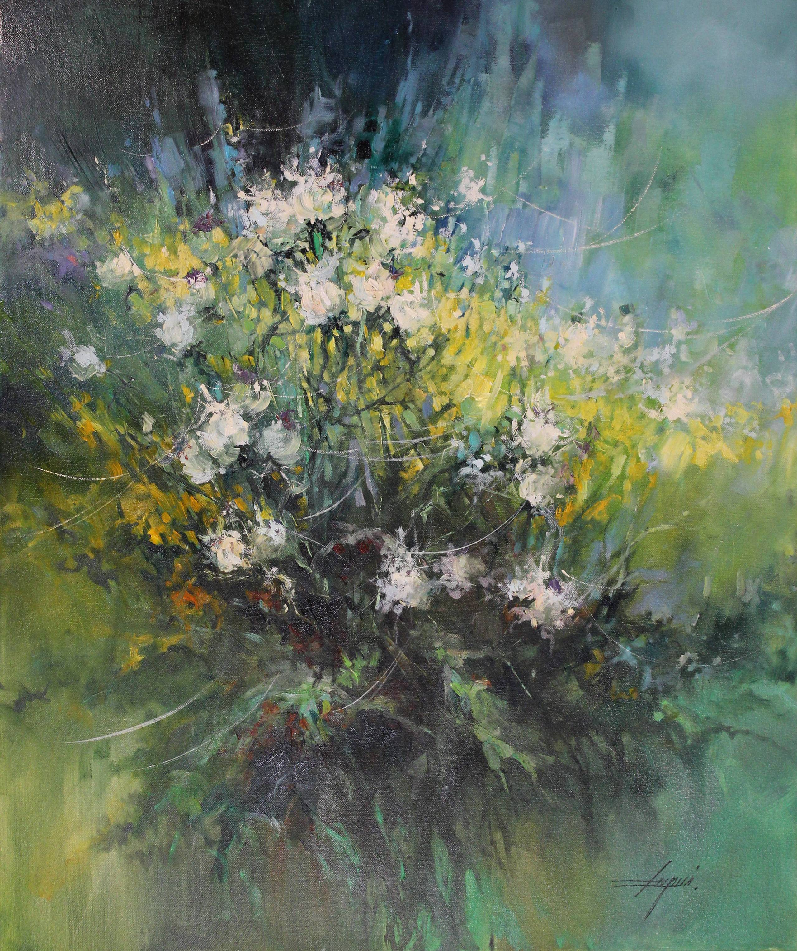Obraz przedstawia bujny, kwiecisty pejzaż, pełen ruchu i intensywności kolorów. Dominują tu zielenie i żółcie, które przeplatają się niczym wiosenny taniec światła i cienia. Białe kwiaty wyróżniają się na tle zieleni, tworząc centralny punkt kompozycji. Całość emanuje świeżością, jak poranek po deszczu, gdy wszystko wokół aż kipi życiem. Patrząc na obraz, można poczuć lekki powiew wiatru. To takie niesamowite uczucie. Artysta wykorzystuje szybkie, dynamiczne pociągnięcia pędzla, co nadaje dziełu wyjątkowy character. Technika impresjonistyczna, pełna łagodnych przejść i subtelnych rozmyć, sprawia, że kompozycja jest niczym marzenie. Dzieło przypomina mi o letnich spacerach po łące. Emocje, jakie wywołuje, to spokój i radość z chwili obcowania z naturą. Jest takie magiczne, że aż nie chce się odrywać wzroku. Myślę sobie, że jest to perfect way, by zatrzymać piękno w czasie. Jakby obraz chciał powiedzieć: "Ciesz się chwilą, bo jest ulotna".