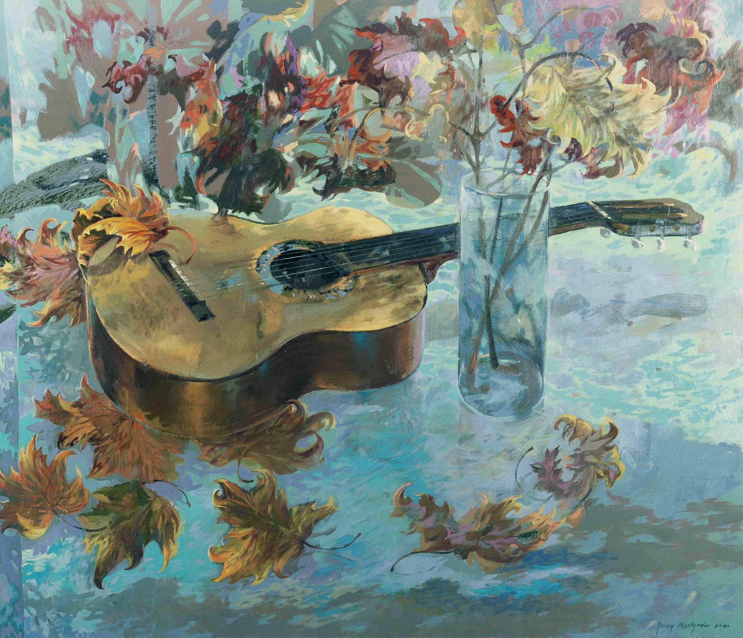 Na obrazie dominuje melancholijny pejzaż jesiennej zadumy. Kolory są subtelnie zgaszone, z przewagą błękitów i żółcieni, z których wyłania się drewniana gitara otoczona wirującymi liśćmi. Ich złociste odcienie przypominają o przemijającym czasie. Całość przypomina rzucony na płótno moment, gdzie cisza gra pierwsze skrzypce. Artysta wykorzystał miękkie pociągnięcia pędzla, by nadać obrazowi delikatność i mglistą tajemniczość. Gitara, centralna postać kompozycji, zdaje się być opuszczona, jakby czekała na muzyka, który przywróci ją do życia. To jest trochę jak nostalgia, ale z delikatnym uśmiechem na twarzy. Obraz emanueje spokojem i pewną nostalgią, jakby mówił: „Stój, chwilo, jesteś piękna”. Te liście wokół gitary, unoszące się jak w tanecznym wirze – maybe it's a dance of memories. Dla mnie to przypomnienie chwil wśród dźwięków muzyki, które jak te liście przemijają, ale zostawiają ślad. To tak, jakby artysta mówił: zagraj coś pięknego, coś co przemocą wyrwie nas z tego zamyślenia. Całość sprawia, że czujemy ciepło i spokój, jak wspomnienie o letnich wieczorach pełnych harmonii.
