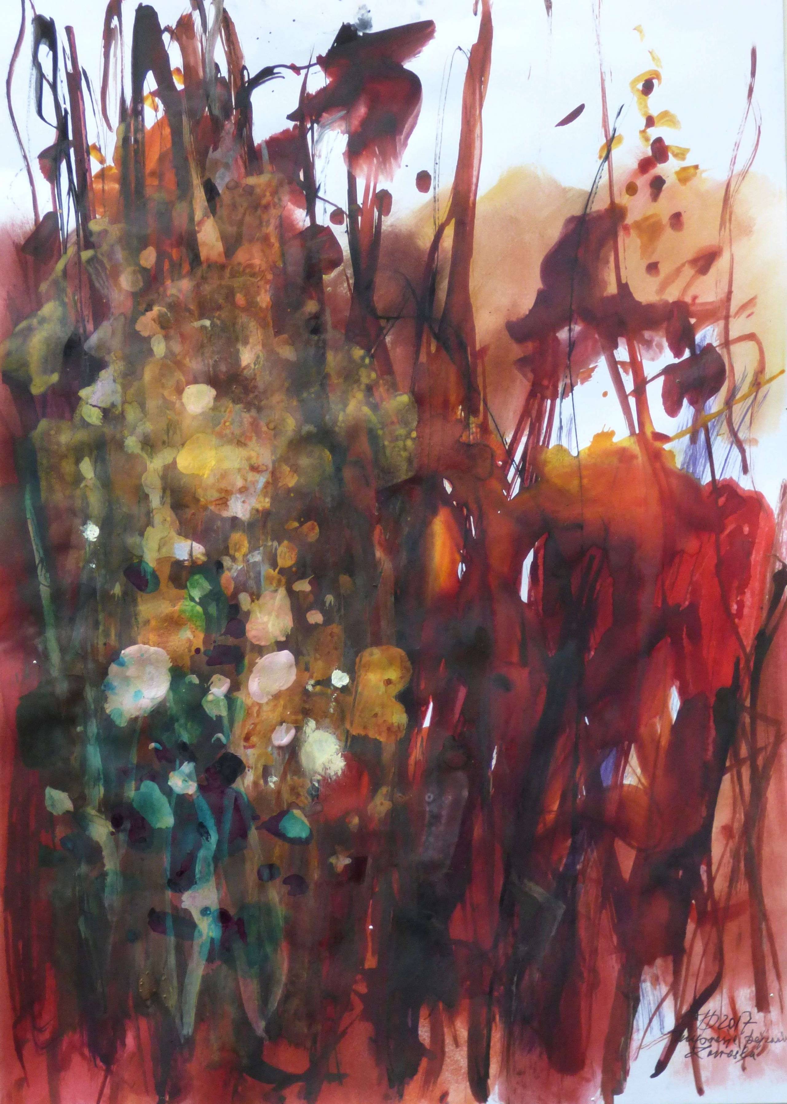 Obraz tętni kolorami, które przypominają barwy jesieni. Ciepłe odcienie czerwieni, pomarańczu i żółci mieszają się z ciemniejszymi plamami zieleni i czerni. To jakby ktoś rozsypał kilka tubek farb na płótnie i pozwolił, by tworzyły własną historię. Kompozycja zdaje się chaotyczna, ale w tym szaleństwie jest metoda. Artysta zręcznie posługuje się techniką akwareli, ukazując płynność i lekkość farb. Czy czujesz to? Tę subtelną grę światła i cienia? Atmosfera tego dzieła jest tajemnicza, niemalże melancholijna, jak powiew wiatru podczas chłodnego wieczoru. Może nawet trochę smutna. Ale, jak mawiają, sztuka jest subiektywna. Każdy widzi coś innego. Dla mnie to jakby sekretny ogród, z którego wyłaniają się zapomniane wspomnienia, a dla kogoś innego – może być po prostu plamą kolorów. "Look!", powiedziałoby dziecko. Więcej pytań niż odpowiedzi. To dzieło może wywoływać różne emocje. Jedni poczują spokój, inni mogą poczuć przytłoczenie. Jedno jest pewne: nie można przejść obok niego obojętnie. To jest prawdziwy force of nature w kategorii ekspresjonizmu. Zajrzyj głęboko w siebie i spróbój znaleźć odpowiedź na pytanie – co to mówi do ciebie?