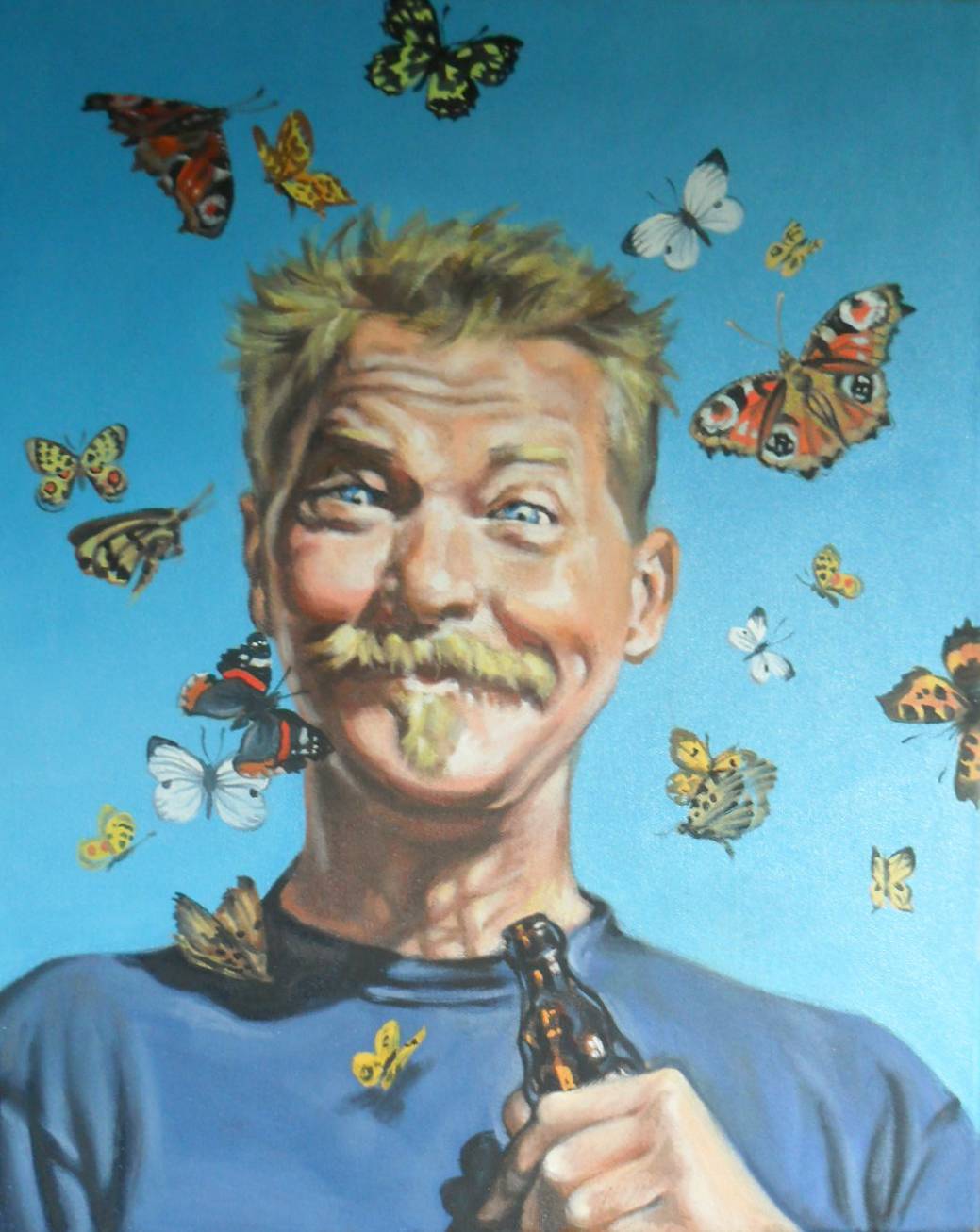 Na obrazie widać mężczyznę z uśmiechem od ucha do ucha, trzymającego butelkę w dłoni. Tło to jasnoniebieskie niebo, które dodaje całości optymistycznej aury. Wokół niego roi się od kolorowych motyli, które wirują jakby w radosnym tańcu. Kolory są żywe i kontrastowe – czerń, pomarańcz i żółć motyli na tle chłodnego błękitu przyciągają oko. Obraz emanuje poczuciem beztroski i szczęścia, jakby chciał powiedzieć: ciesz się chwilą! Styl artystyczny jest realistyczny, choć z lekkim przymrużeniem oka. Artysta używa technik, które podkreślają teksturę skóry i detale skrzydeł motyli. Można poczuć lekkość i swobodę, jaką przynosi lato. Obraz może wzbudzać również nostalgię za czasami dzieciństwa, kiedy świat był pełen motyli i radości. Małe dziecko mogłoby powiedzieć: „Te motyle są magiczne!” Z jednej strony, jego uśmiech przypomina o prostych radościach życia. Z drugiej, motyle mogą symbolizować coś ulotnego, chwilowego. It's a beautiful mess. Patrząc na ten obraz, odczuwa się chęć, by zatrzymać tę chwilę na dłużej i zagnieździć w niej swoją codzienność jak w przytulnym kokonie.