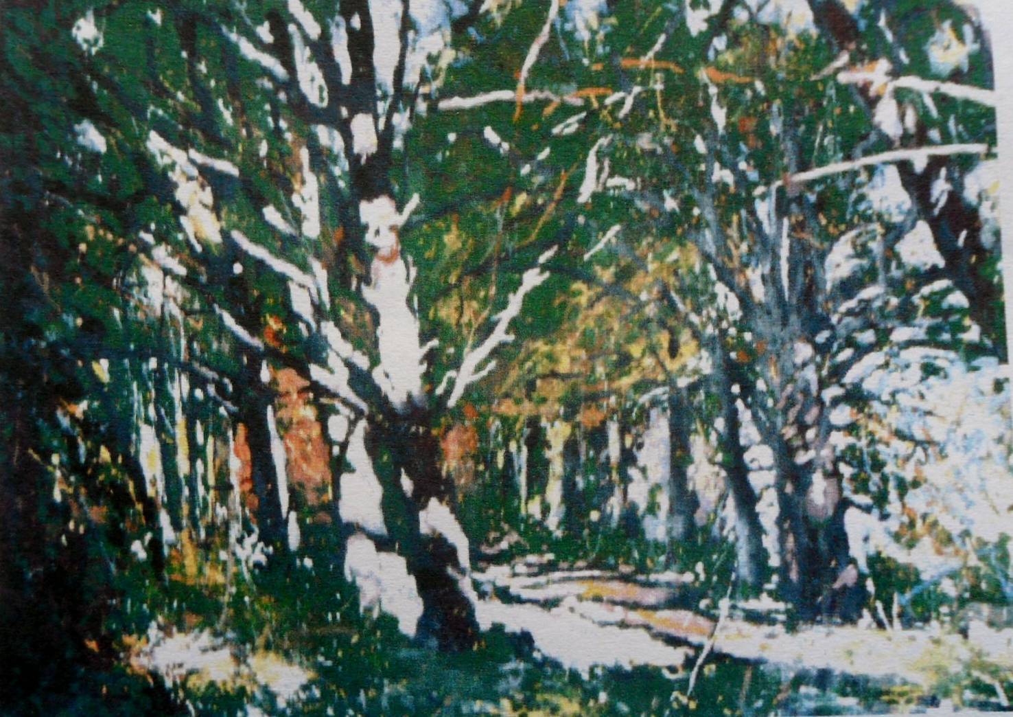 Obraz przedstawia gęsty las pełen drzew, które zdają się kołysać na wietrze. Dominują soczyste zielenie, miejscami przeplatane złocistymi i srebrzystymi refleksami, tworzac wrażenie migoczącego światła, jakby to było "forest magic". Kompozycja jest gęsta, drzewa wyrastają z podłoża niczym strażnicy lasu, tworząc korowód kształtów i cieni. Nastrój obrazu jest dynamiczny, ale zarazem uspokajający. Można poczuć delikatny zapach drzew i słyszeć śpiew ptaków. Styl artysty może przypominać impresjonizm z fleszami światła i dynamiczną krechą. Patrząc na obraz, można poczuć wewnętrzny spokój i tęsknotę za naturą. Wywołuje on w sercu tęsknotę za wolnością i przestrzenią. Uwaga skierowana na detale, jakby każde drzewo opowiadało swoją własną historię. To miejsce mogłoby być idealne do zabawy w chowanego, krzyknęłoby dziecko. To naprawdę coś pięknego.✨