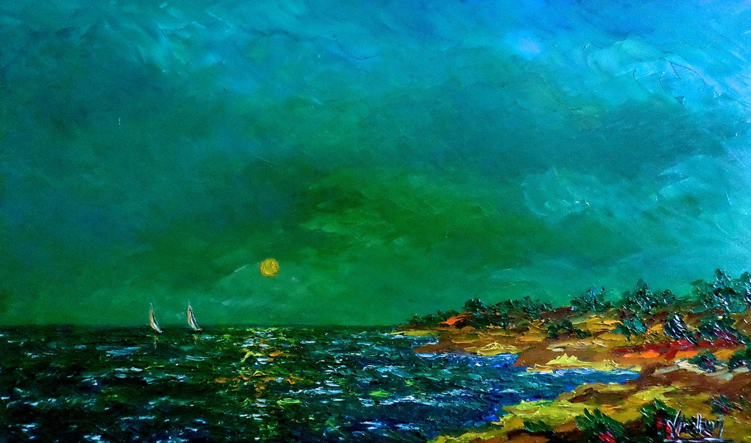 Na obrazie dominują morskie i zielone tony, kontrastujące z żółtym blaskiem słońca lub księżyca, który wydaje się tańczyć na szmaragdowej wodzie. Wirujące fale zdają się śpiewać szeptem ciszy, a drobne żaglówki na horyzoncie wyglądają jak dwie białe muszki na rozległym morzu. Kompozycja jest dynamiczna, a jednocześnie kojąca, prowadząc oko od burzowej powierzchni wody po spokojne, barwne brzegi. Ten obraz ma w sobie coś z magicznej chwili, jakby świat na chwilę stanął w miejscu. Jest w tym ukryty "sense of wonder", uczucie odkrycia nowego świata. Malarka używa grubych pociągnięć pędzla, budując fakturę i głębię, co dodaje obrazu ekspresyjności. To jak mruczenie kota przy kominku. Obraz wzbudza nostalgię i pragnienie ucieczki do miejsca, gdzie czas zwalnia. Czyż nie jest to idealna sceneria na wakacyjny relaks? Myślę sobie, że mogłabym tam być, siedzieć na brzegu, myśląc o niczym. Dziecko mogłoby powiedzieć: "Fale są olbrzymie jak góry!" To takie proste, a ile w tym prawdy. Obraz jest jednym z tych, które oglądamy z lekkim uśmiechem na twarzy. Zachęca do marzeń i zanurzenia się w chwili obecnej.