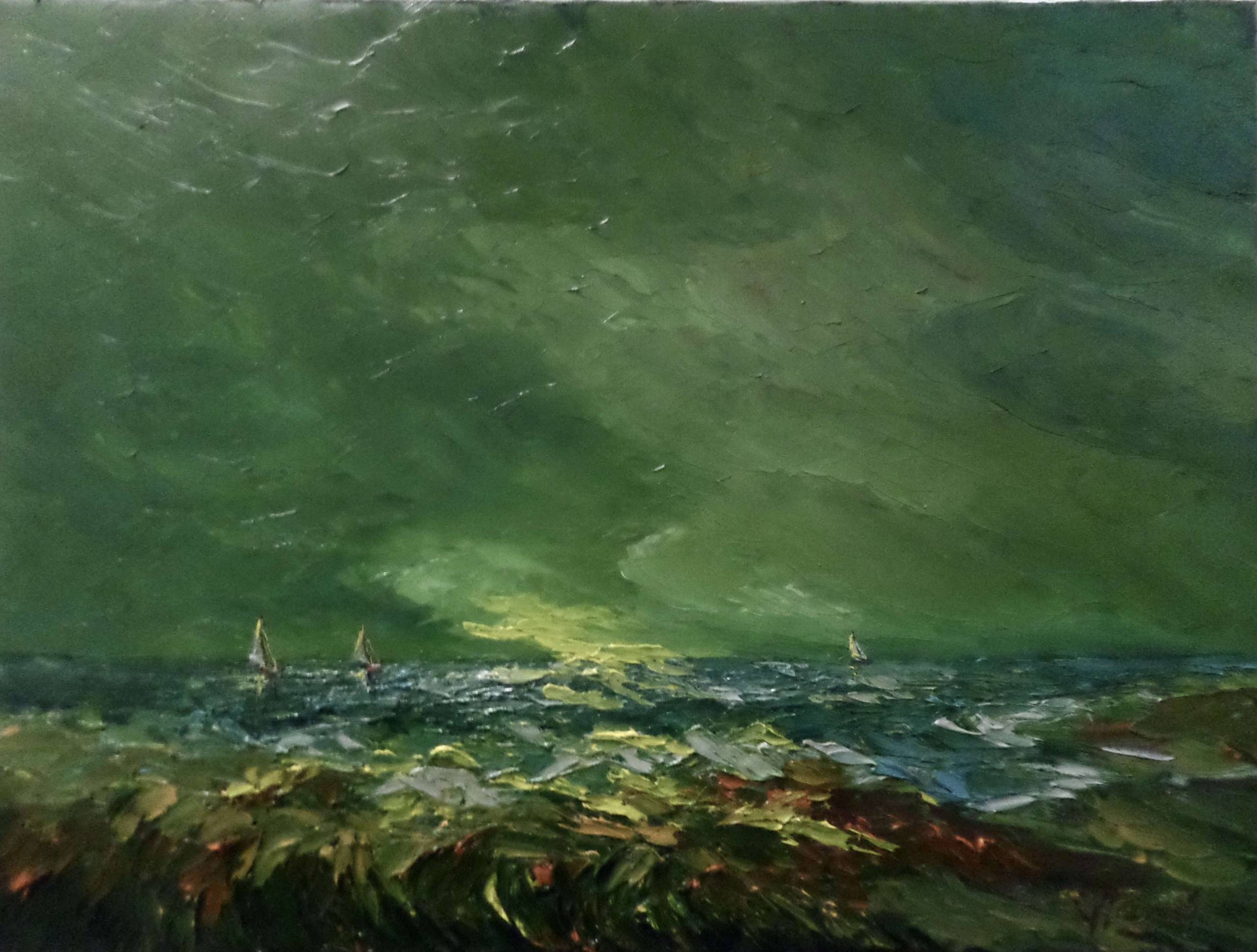 Obraz emanuje potęgą natury, malowany w przeważających odcieniach zieleni, przyciągając wzrok jak magnes. Widok wzburzonego morza i ciemnego nieba tworzy kompozycję dynamiczną, pełną ruchu i niepewności. Dwie maleńkie łodzie zdają się walczyć z falami, stanowiąc kontrast dla nieokiełznanego żywiołu. Atmosfera jest pełna napięcia i tajemniczości, jakby za chwilę miało się coś wydarzyć. To właśnie taki "stormy weather", które nas fascynuje, ale jednocześnie trochę przeraża. Artysta używa techniki impasto, co daje efekt głębi i faktury. Pociągnięcia pędzla są energiczne, nierówne, co dodaje dramatyzmu. Można poczuć, jak serce zaczyna bić szybciej na widok tego dzieła. Obraz może budzić różne emocje. Jedni poczują melancholię, inni ekscytację. Dziecko mogłoby powiedzieć: "Ojej, jakie duże, zielone morze!" I to właśnie te proste słowa oddają część uroku i złożoności tego obrazu. Podczas patrzenia pojawia się refleksja o bezmiarze możliwości i tajemnicach natury. Obraz ma w sobie coś nieuchwytnego, co przyciąga jak magnes i trzyma na długo.