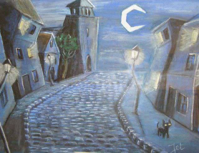 Na obrazie widzimy tajemniczą uliczkę, skąpaną w zimnych odcieniach błękitu i szarości. Kamienice wydają się lekko pochylone, co dodaje całości surrealistycznego klimatu. Uwagę przykuwa masywna wieża po lewej stronie, patrząca na nas z góry. Jej szary kolor w połączeniu z przygaszoną zielenią pobliskiego drzewa wprowadza atmosferę pogody i spokoju. Księżyc na niebie przypomina literkę "C", co dziecko mogłoby nazwać po prostu ciekawym. Technika malarska to jakby połączenie impresjonizmu z nutą abstrakcji. Pociągnięcia pędzla są dynamiczne, a linie nieco zniekształcone, co sprawia, że widz czuje się jakby wkraczał do świata marzeń. Czarny kot, stojący obok latarni, dodaje odrobiny niepokoju. Może symbolizować samotność lub tajemnicę nocy. U mnie obraz wywołuje uczucie nostalgia, jakbym spacerował po starych, zapomnianych uliczkach. W tle tej kompozycji wyczuwamy echo „mystery”, skradającej się we mgle. To dzieło kusi, by zatrzymać się na chwilę i zastanowić nad jego ukrytym przesłaniem. Choć wygląda na cichy, w rzeczywistości jest pełen niedopowiedzianych historii.