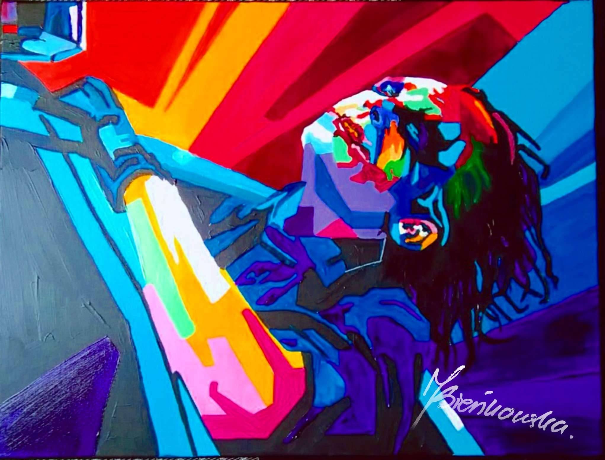 Obraz jest eksplozją kolorów – od intensywnych czerwieni po głębokie błękity. W centrum kompozycji widzimy postać utkaną z geometrycznych kształtów, co dodaje całości dynamiczności. Artysta zastosował kontrastujące barwy, które tworzą niemal kalejdoskopowy efekt. Światło pada na twarz, co przyciąga uwagę i tworzy magiczną aurę. Obraz emanuje energią, jest pełen życia. Wygląda jak fragment marzenia, gdzie rzeczywistość miesza się z fantazją. Styl malarski jest odważny, może kojarzyć się trochę z modernizmem. Technika artystyczna polega na wykorzystaniu grubych pociągnięć pędzla i ostrych konturów, co dodaje dramatyzmu i intensywności. Patrząc na ten obraz, można poczuć się jak w środku burzy emocji. Dla mnie osobiście, jest to podróż do wnętrza duszy. Wywołuje refleksję nad tym, jak postrzegamy siebie i świat wokół. "Wow, te kolory są super!" – mógłby powiedzieć mały dzieciak. Jednocześnie można dostrzec subtelne gry cieni i świateł, które nadają głębi i wymiaru. Jest coś magicznego w tej harmonii chaosu. Słowo, które przychodzi na myśl, to "vibrant". Artysta wciąga nas do swojego świata, pełnego kontrastów i niezwykłych emocji. Fascynujące, prawda?