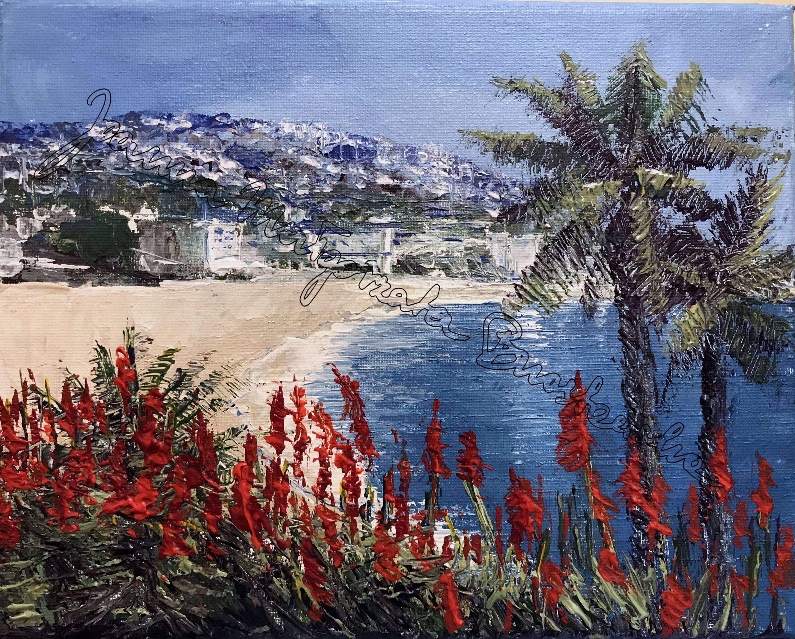 Obraz przedstawia malowniczy pejzaż z widokiem na plażę. Na pierwszym planie widzimy intensywnie czerwone kwiaty, które wręcz wybuchają kolorami na tle soczyście zielonych liści. Po prawej stronie majestatyczne palmy balansują swymi rozłożystymi koronami na tle głębokiego niebieskiego morza. W oddali zarysowują się góry, lekko zamglone, tworząc subtelny kontrast do błękitnego nieba. Artysta użył wyraźnych pociągnięć pędzla, podkreślających dynamiczny charakter kompozycji. Całość emanuje spokojem i wakacyjną beztroską, jakby zapraszając widza do zanurzenia się w tym idyllicznym krajobrazie. "Wow, ale palmy" – to mogłoby powiedzieć dziecko, patrząc na to dzieło. Technika malarska to czysta impresja, gdzie kolory i światło grają pierwsze skrzypce. Patrząc na ten obraz, czuję się jakby na chwilę przeniósł mnie w inny świat, gdzie liczy się tylko relaks i słońce. Myślę sobie, "take a break" i zanurz się w tej spokojnej atmosferze. To spojrzenie pełne życia i harmonii, idealne, by oderwać się od codzienności.