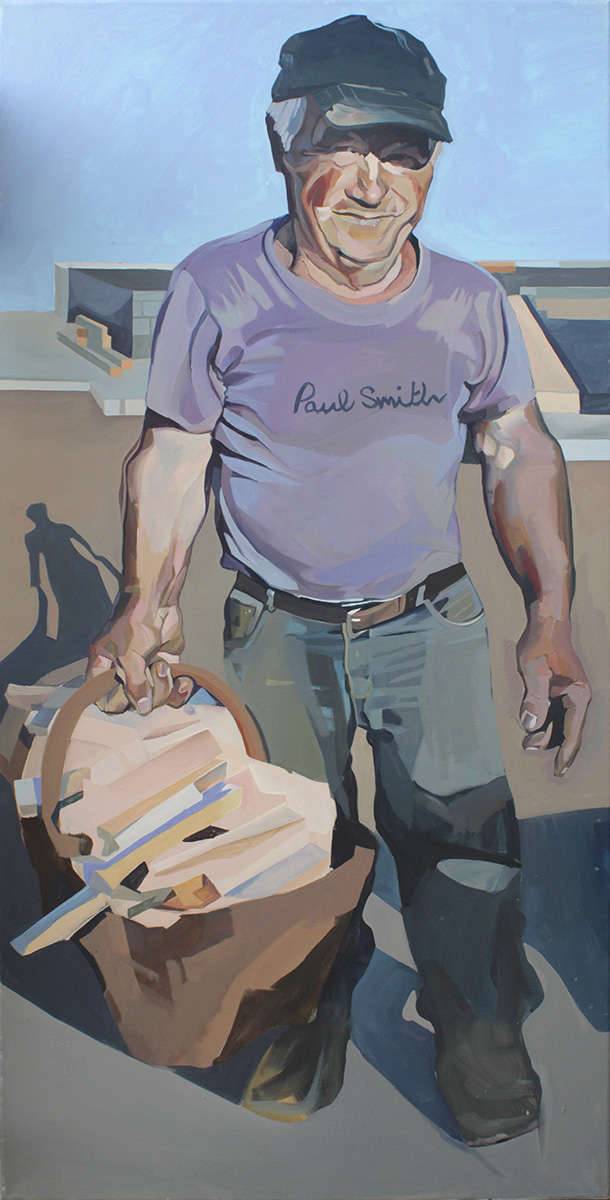 Obraz przedstawia mężczyznę w fioletowej koszulce i czapce, z promiennym uśmiechem na twarzy. Mężczyzna trzyma w dłoni koszyk pełen drewna, a wokół niego snuje się tanecznie cień. Tło jest minimalistyczne; delikatne odcienie błękitu kontrastują z ciemniejszymi plamami, tworząc atmosferę spokoju. Artyzm obrazu, to gra półcieni oraz geometrycznych kształtów, które nadają scenie dynamiczny, niemal kinowy charakter. Wydaje się, że technika malarska opiera się na półrealistycznym stylu z nutką impresjonizmu. Atmosfera bijąca z obrazu to połączenie codzienności i pewnej magii. Ten człowiek z koszykiem – jakby codziennie wyruszał w podróż, zwyczajną, ale pełną ukrytych znaczeń. Styl artysty to balans między realizmem a abstrakcyjną wizją, z wyraźnym zaakcentowaniem detali. Patrzę na ten obraz i czuję ciepło, niemal jakby słońce przez okno zaglądało. To niezwykłe, jak prosty motyw może przywołać tak wiele emocji. Myślę o dzieciństwie, o zabawach na podwórku. To takie nostalgiczne, prawda? Oh, what a beautiful simplicity, mógłbym powiedzieć. Czyż nie jest to esencja sztuki – budzenie emocji z codziennych chwil?