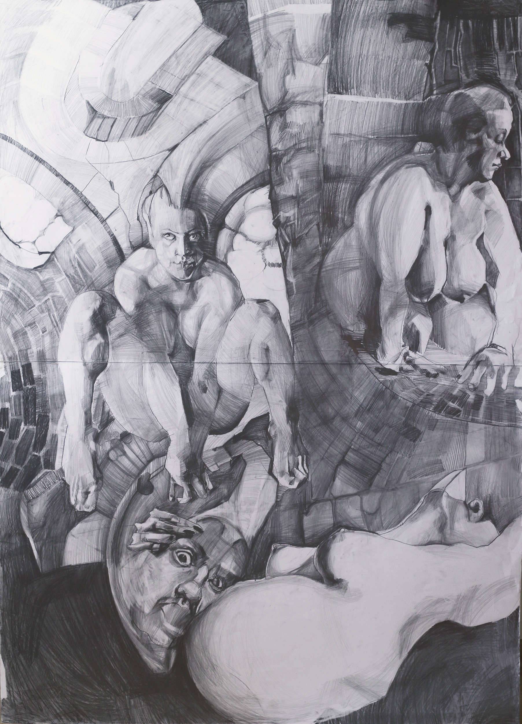 Rysunek z cyklu "Sacrum profanum prokreacja". Praca ołówkiem na bristolu. Format z dwóch sklejonych arkuszy papieru formatu B1.