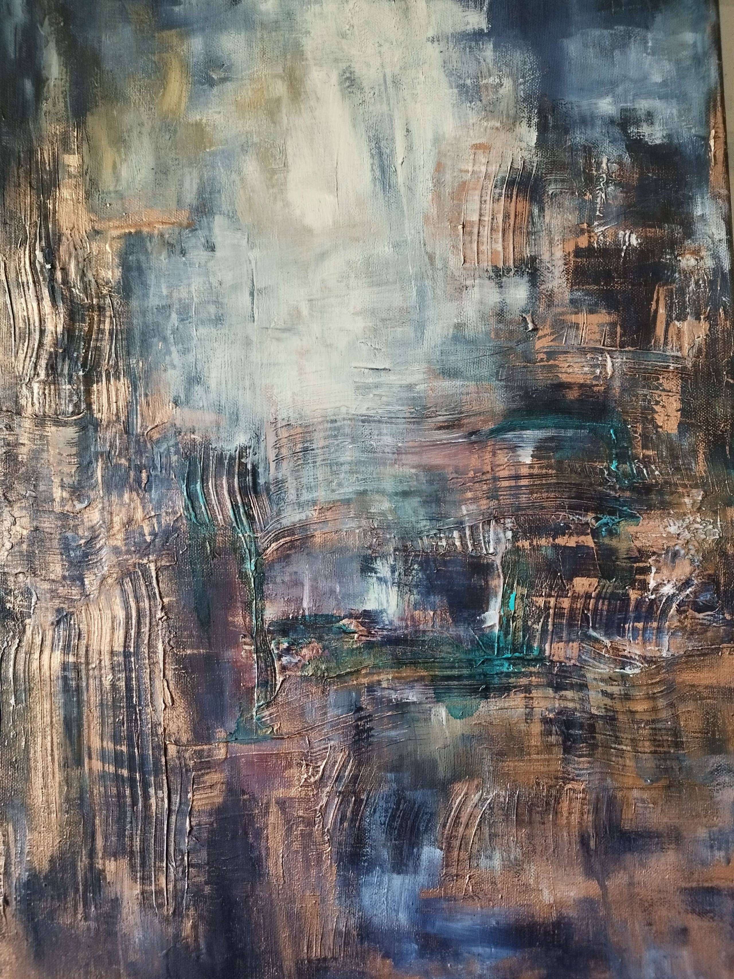Ten obraz jest jak tajemnicza mapa nieznanej krainy zaklęta w mieszance kolorów. Dominują tu odcienie błękitu, zieleni i głębokiego brązu, które w połączeniu z subtelnym naświetleniem bieli i beżów tworzą unikalną kompozycję. Barwy zdają się przelewać i mieszać, niczym chmury na wietrznym niebie. Nieliczne ślady pędzla, widoczne na płótnie, dają wrażenie ruchu i głębi. Styl obrazu przypomina abstrakcjonizm, gdzie artysta posługuje się techniką impastową. Farba jest nakładana grubymi warstwami, tworząc wypukłości i zawiłości, które można by z ciekawością badać godzinami! Patrząc na to dzieło, czuć spokój, ale też pewną nutkę niepokoju. Może to właśnie dlatego, że każdy widz może dostrzec tam coś innego – dla jednych będzie to pejzaż ze snu, dla innych wyjątkowa gra świateł i cieni. Dziełko to może wywołać w odbiorcy różnorodne emocje – od zachwytu po nostalgię. No i te kolory, naprawdę "pop" jak to mówią! Na myśl przychodzi mi refleksja, że obraz jest jak tajemnica – zawsze można odkryć w nim coś nowego. Dla mnie ten obraz jest jak bajka bez słów, w której można się zatopić i powracać do niej z niezmienną fascynacją.