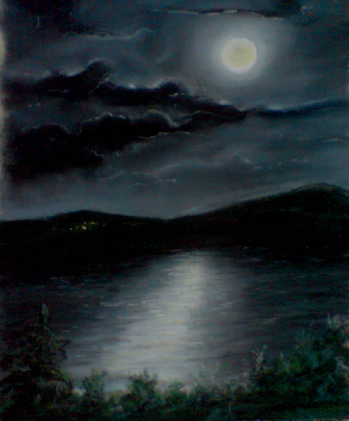 Obraz przedstawia nocny krajobraz z tajemniczą aurą, której centrum stanowi jasno świecący księżyc. Jego blask rozprasza się na wodzie, tworząc magiczny, srebrzysty refleks. Niebo jest ciemne, pełne gęstych, granatowych chmur, które dodają dramatyzmu. Leśna zieleń na dole płótna kontrastuje z łagodnym światłem księżyca. Wygląda to jak idylliczna scenka, pełna cichego spokoju, ale i nieco groźna. Artysta użył techniki rozmycia, co nadaje całości wrażenie ruchu. Chmury zdają się płynąć, a woda migotać. Ten efekt, nazwijmy to wet-on-wet, sprawia, że obraz tętni życiem. Motyw księżyca zawsze działa na wyobraźnię, a tu szczególnie wpływa na senność i zadumę. To jak być bohaterem własnych marzeń sennych. Patrzę na to dzieło i czuję, jakbym sam stał nad brzegiem tego jeziora. Ciekawe, czy tam jest zimno? Obraz przenika nostalgia, coś w rodzaju tęsknoty za przygodą. Może to przypomnienie o nieprzemijającym pięknie natury? Albo wezwanie, by na chwilę zwolnić i zauważyć magic moments. To jak podróż w głąb siebie. Siedmiolatek by powiedział: “Duży księżyc robi jasno w nocy, jak latarka!” I jest w tym trochę racji.
