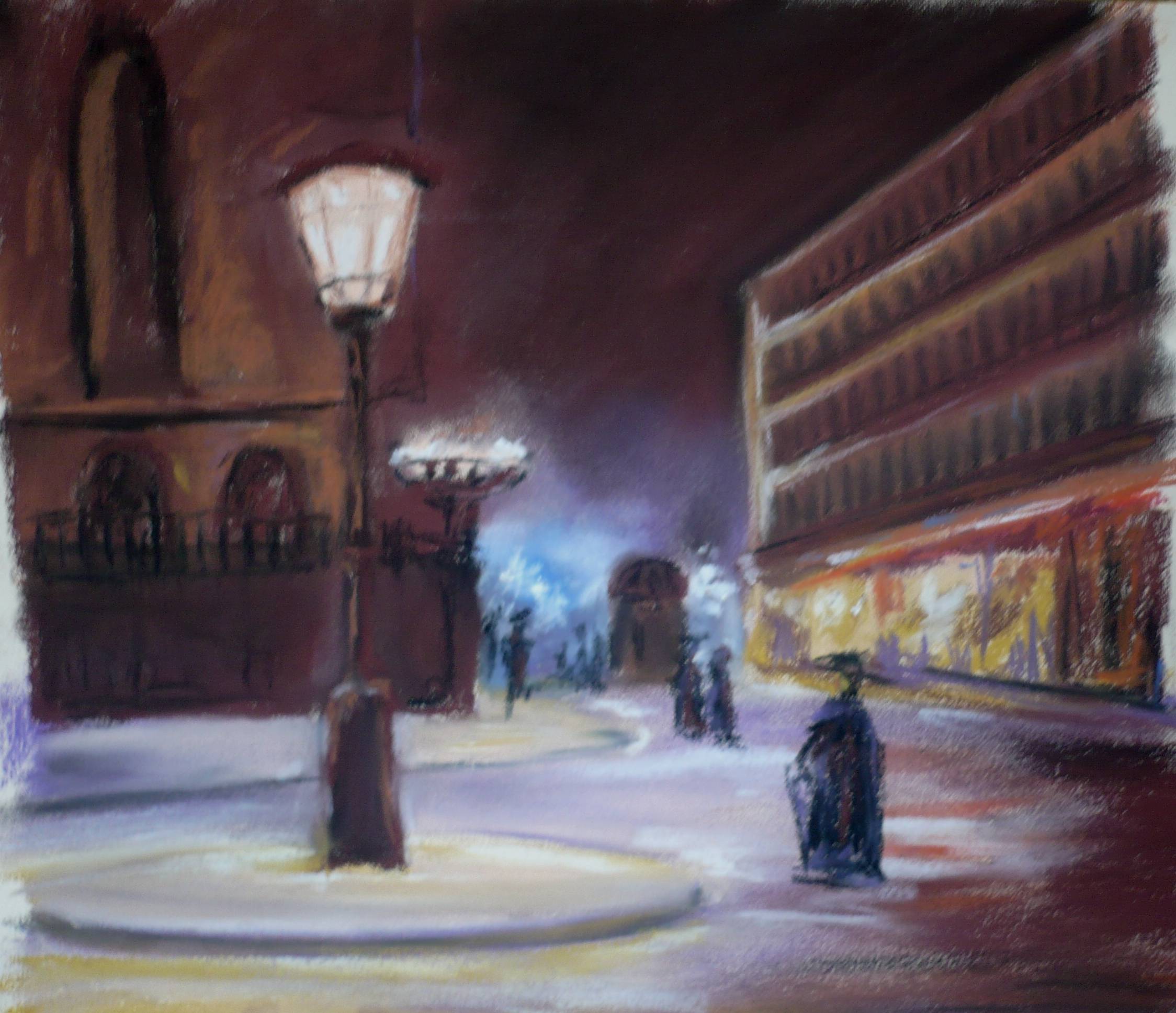 Obraz nawiązuje do nocnej scenerii miejskiej ulicy, gdzie ciepłe, żółtawe światło latarni delikatnie rozprasza ciemność. Kolory są miękkie i zamglone, z dominującymi odcieniami brązu i bordo, co nadaje całej kompozycji tajemniczy i nostalgiczną aurę. Kształty budynków są lekko rozmazane, jakby artysta użył techniki pasteli, by uchwycić efemeryczny klimat. Latarnia, stojąca po lewej, niczym strażnik nocy, przyciąga wzrok, tworząc centralny punkt obrazu. Atmosfera jest spokojna i refleksyjna, zdaje się zachęcać do zatrzymania się na chwilę i zasłuchania się w ciszy nocnej ulicy. Styl artysty jest impresjonistyczny, z naciskiem na emocjonalny oddźwięk sceny, a nie konkretne detale. Ta technika nadaje pracy dynamiczności, jakby pejzaż tętnił życiem. Można poczuć nutkę melancholii, przemijania, jakby każda chwila miała być uchwycona, ale nie na zawsze zatrzymana. Patrząc na ten obraz, wyobrażam sobie śpiew ptaków, cichutki, jakby zza kurtyny nocy. Myślę o wieczorowym spacerze z filiżanką gorącej herbaty w ręce. To taki picture, który zostaje w sercu na długo. Dzieciak by powiedział: "Światło tańczy z cieniem, mamo!" Całość przywołuje wspomnienia dawnych, spokojnych wieczorów, kiedy czas płynie wolniej, a życie wydaje się prostsze.
