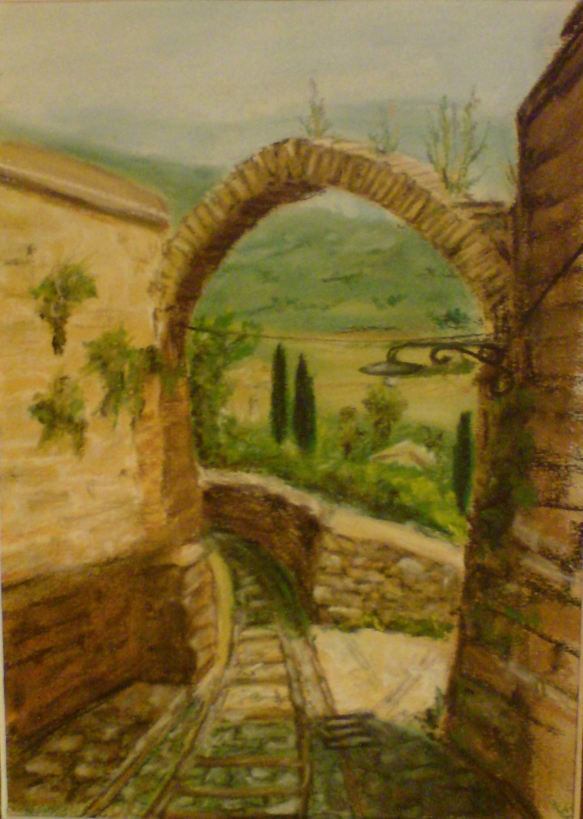 Obraz przedstawia kamienny łuk, otoczony żywą zielenią i delikatnymi, miękkimi kolorami natury. W centrum kompozycji znajduje się starannie zbudowany łuk, który prowadzi oko widza ku malowniczej panoramie zielonych wzgórz i smukłych, ciemnych cyprysów w oddali. Ciepłe odcienie brązu i ochry dominują w kamieniach, a ich tekstura zdaje się opowiadać historię wieków. Atmosfera tej sceny jest spokojna i refleksyjna. Łatwo można się poczuć, jakbyśmy przekraczali portal do innego, wolniejszego świata. Użyte tu techniki malarskie, takie jak subtelne cieniowanie i miękkie pociągnięcia pędzla, dodają głębi i realności całemu obrazowi. Jest to styl, który można nazwać rustykalnym z nutą impresjonizmu. Moje serce naprawdę się raduje, patrząc na to dzieło. Urok i nostalgia płyną z każdego kąta obrazu. Wyobraź sobie, jakie historie mogłyby się tu wydarzyć. Wiesz, co pomyślałem? To wygląda jak miejsce z bajki! Artysta uchwycił moment, który może wywoływać tęsknotę za spokojnymi chwilami blisko natury. To miejsce jest "timeless", pełne nieprzemijającego uroku. A gdyby zapytać dziecko, co widzi na tym obrazie, pewnie powiedziałoby, że to tajemniczy tunel do magicznej krainy pełnej przygód. Tak, obraz ten jest pełen emocji i osobistych refleksji, które angażują nasze wewnętrzne marzenia.