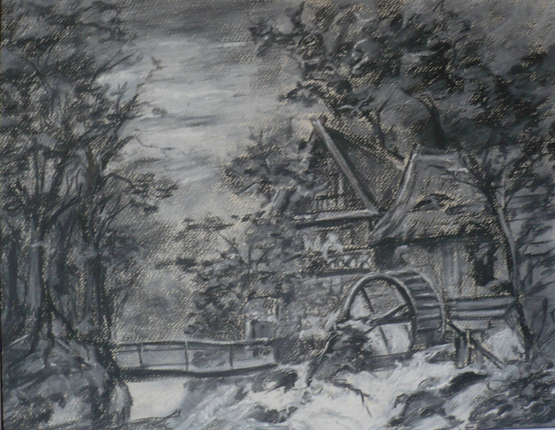 Na obrazie widzimy spokojną scenę przy młynie, utrzymaną w stonowanych odcieniach szarości. Drzewa otaczają drewniany młyn, który z wdziękiem wtapia się w otaczający go krajobraz. Kształty są delikatne, tworząc płynną kompozycję, która prowadzi wzrok ku niebu. Całość ma nostalgiczny, nieco tajemniczy nastrój, jakbyśmy przenieśli się w dawne czasy. Artysta wykorzystał technikę rysunku węglem, co dodaje pracy surowości i dramatyzmu. Czarno-biała paleta wzmacnia poczucie starożytnej historii, a zarazem daje kopa emocjom. Młyn, z jego kołem poruszanym przez wodę, zdaje się szepnąć opowieści sprzed lat. Obraz budzi przeróżne uczucia, od spokoju po lekką nostalgię. Patrząc na niego, można zatopić się w marzeniach. To jakby mała podróż w czasie. Myślę sobie: wow, jakby to było mieszkać w takiej chatce! Chwila refleksji nad życiem w prostszym świecie. Może to trochę magiczne miejsce, gdzie czas płynie inaczej. A może to tylko mój mind playing tricks.