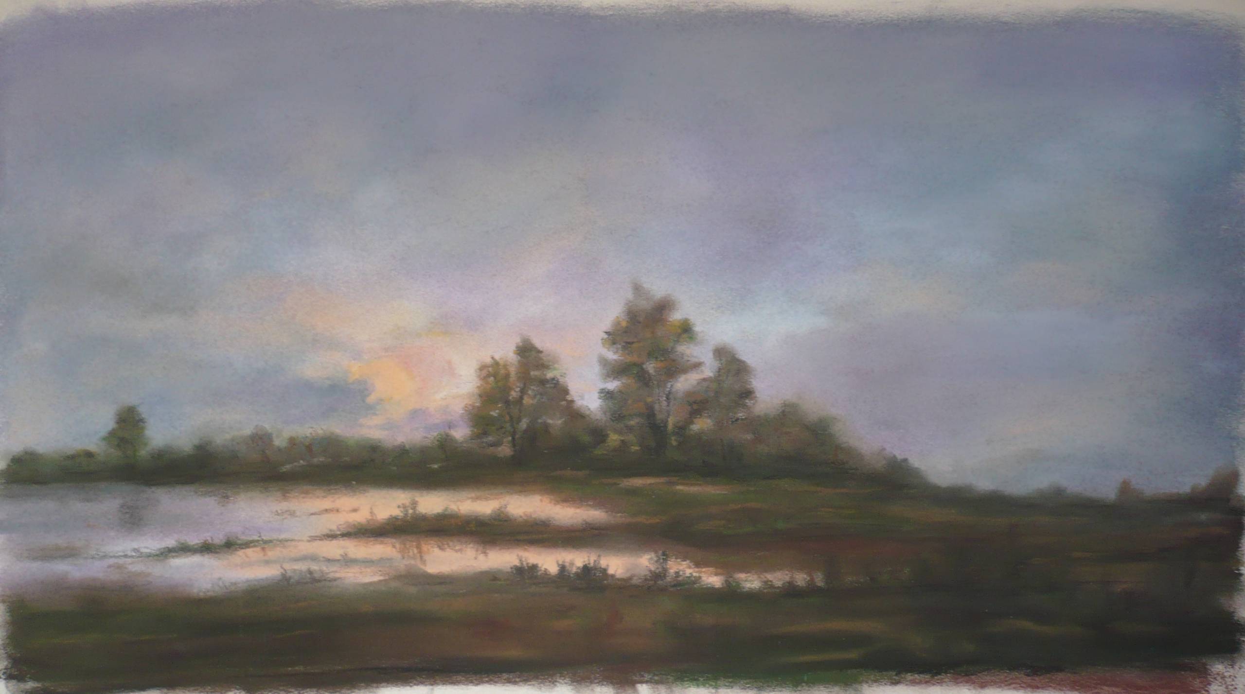 Na obrazie widzimy spokojny pejzaż, w którym dominują stonowane tony niebieskiego, zieleni i delikatne odcienie purpury. W centrum kompozycji znajduje się grupa drzew odbijająca się w gładkiej tafli wody. Niebo zdobi subtelna gra światła, sugerując wczesny poranek lub późny zmierzch. Mimo pewnej tajemniczości i zamglenia, atmosfera jest niezwykle uspokajająca. Można niemal poczuć lekki powiew wiatru. Artysta zastosował technikę pasteli, co nadaje obrazowi miękkość i specyficzną mglistą aurę, jakby wszystko było otulone welonem. Widz może poczuć się zrelaksowany, oddany refleksji, zapatrzony na spokojne odbicie natury. Obraz zachwyca prostotą, ale podszytą głębokim sensem. Wow, jak pięknie! Wygląda jak magiczny świat, do którego chce się wskoczyć. Te detale mogą przyciągać uwagę na dłużej, a melancholia krajobrazu skłania do zadumy. To prawdziwa chwila "escape" od codzienności.
