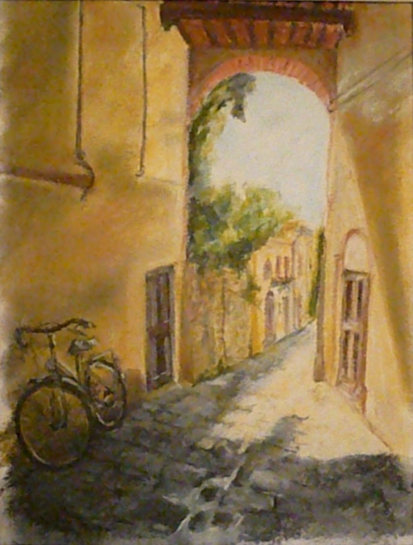 Obraz przedstawia malowniczy zaułek, pełen ciepłych, słonecznych barw. Dominują odcienie żółci i brązu, które emanują przytulnym ciepłem. Cienie na kamiennej posadzce prowadzą wzrok w głąb uliczki, gdzie za łukiem ukazują się drzewa i budynki. W kącie opiera się na murze stary rower, dodając nieco nostalgii i spokoju całej scenie. Kompozycja jest harmonijna, lecz nie brakuje jej subtelnego dynamizmu. Artysta używał delikatnych pociągnięć pędzla, co nadaje całości nieco impresjonistyczny charakter. Atmosfera jest nostalgiczna, a jednocześnie pełna uroku codzienności. Można poczuć, jak chwilowe zatrzymanie w tej spokojnej uliczce daje wytchnienie i relax from the urban rush. Całość przywołuje wspomnienia letnich spacerów i odkrywania nowych zakątków miasta. Widok roweru budzi w sercu ciepłe uczucia, jakby zaraz miał ktoś na nim odjechać w stronę przygody. "Mamo, ja chcę taki rower!" mogłoby krzyknąć dziecko. Obserwując scenę, można odczuć tęsknotę za prostymi, spokojnymi chwilami w życiu, gdy czas nie goni tak bezlitośnie.