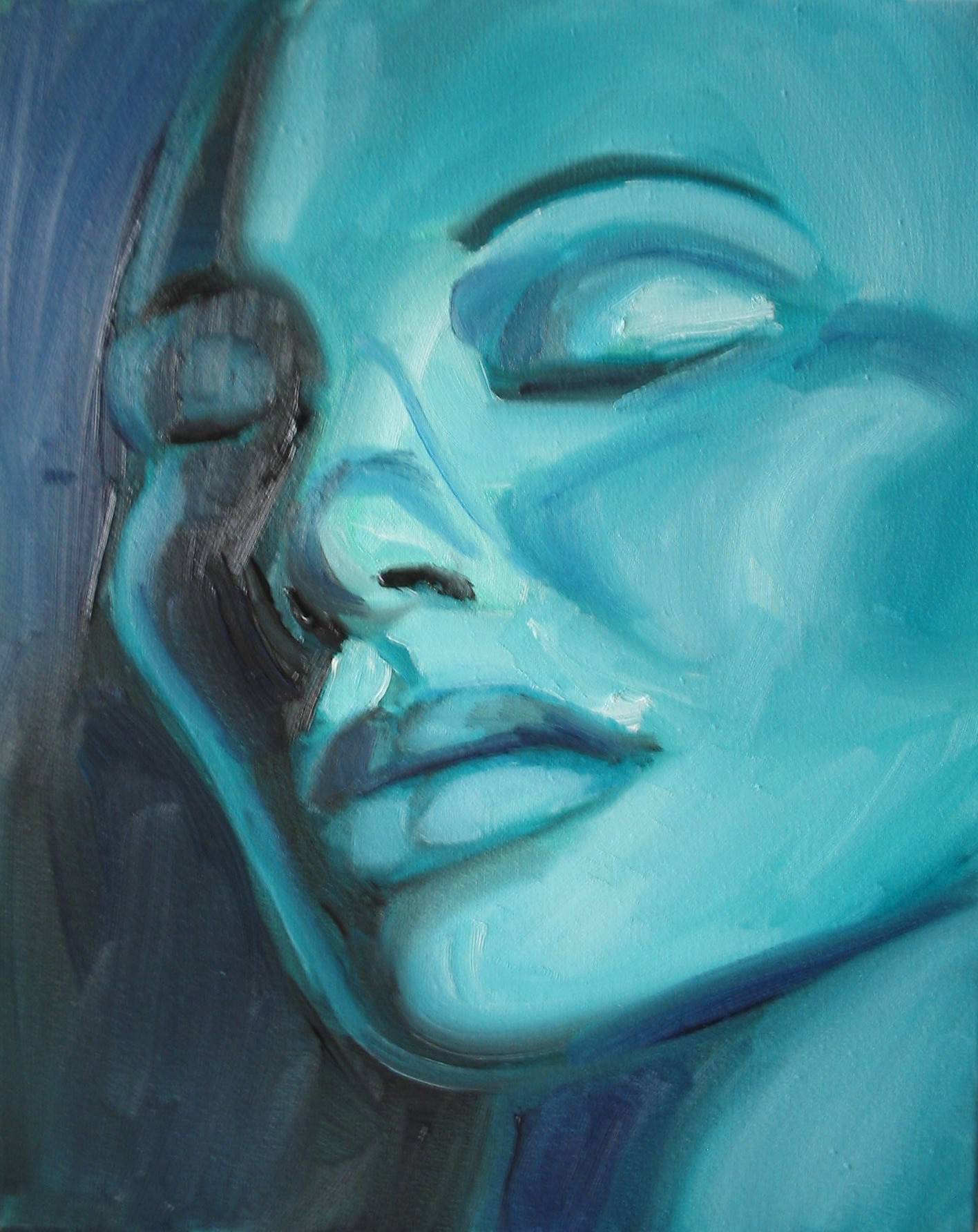Obraz przedstawia twarz w odcieniach błękitu, który niczym ocean rozlewa się po płótnie. Kształty są łagodne, smukłe linie dodają całości elegancji. Kompozycja koncentruje się na zamkniętych oczach, co wprowadza aurę spokoju i zadumy. Widzimy tu pewną tajemniczość, jakby postać unosiła się w innym wymiarze. Technika malarska wskazuje na dynamiczne pociągnięcia pędzla, które dodają obrazu ekspresji. Olejne farby czynią kolory głębszymi. Ten spokój graniczący z melancholią może skłaniać do refleksji nad naszymi marzeniami. Jest coś captivating w tej twarzy, co przyciąga i zatrzymuje wzrok na dłużej. A ja sobie myślę, co by się stało, gdyby te oczy się otworzyły? Może nagle zobaczylibyśmy inny świat? To dzieło, które potrafi zahipnotyzować odbiorcę. Ja myślę, że ta pani jest smutna, bo nie ma cukierków. Takie obrazy zachęcają do zadawania pytań i szukania własnych odpowiedzi, stają się lustrem naszych uczuć.