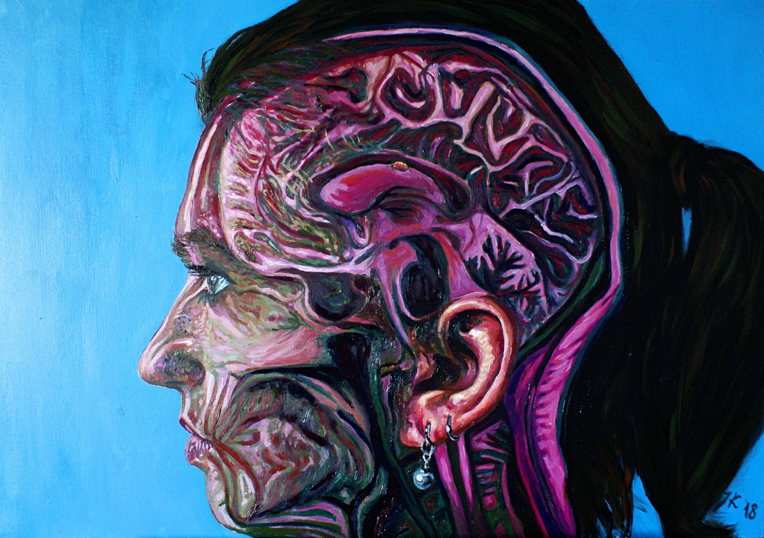 Obraz jest niesamowity! Ukazuje profil twarzy z fascynującym przekrojem przez ludzką głowę. Artysta użył jaskrawych odcieni różu, czerwieni i zieleni do przedstawienia wnętrza czaszki i mózgu. To zderza się z gładkim, niebieskim tłem, które nadaje dziełu mocnego kontrastu. Wygląda jak mapka do wnętrza naszej duszy. Kompozycja przypomina podróż do wnętrza laboratoryjnej mikstury lub tajemnicze odkrywanie tajników ludzkiego ciała. Patrząc na ten obraz, czuje się pewien niepokój, ale też fascynację. It's a mix of awe and curiosity. Artysta zastosował techniki po mistrzowsku - szczegółowość, ale i pewna surowość pociągnięć pędzla sprawiają, że patrzymy z zaciekawieniem na każdy detal. Działanie artysty wręcz hipnotyzuje. Jak bym był mały, powiedziałbym, że to superbohater z rentgenem w oczach. Obraz wywołuje głębokie refleksje nad naszym wnętrzem. Dlaczego jesteśmy tacy skomplikowani, a jednocześnie tak piękni w swojej chaotyczności?