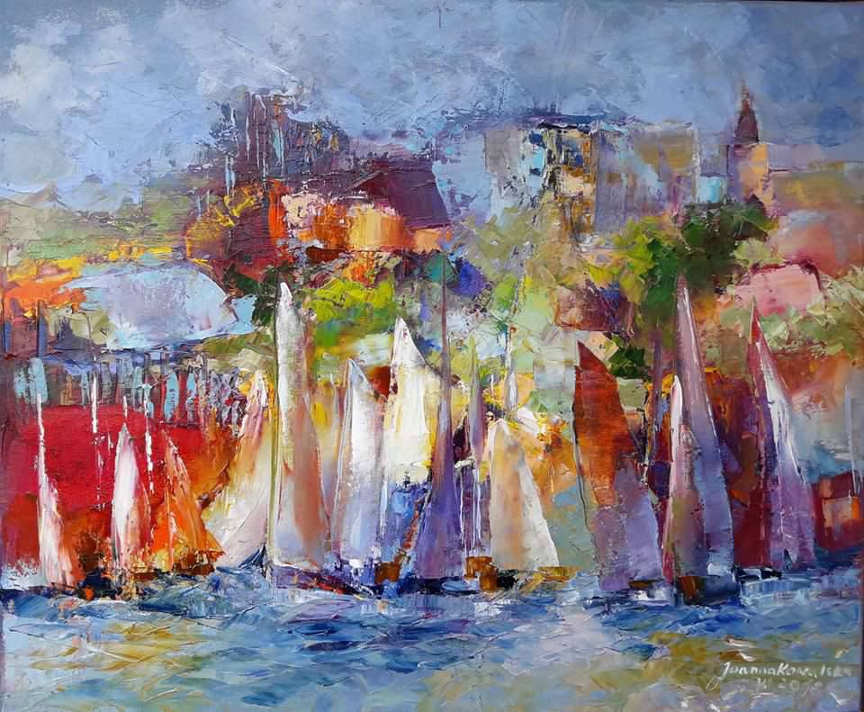 Moje miasto,obraz o bardzo żywych,czystych kolorach, farba nakładana szpachlą,gruba faktura.Jako prezent na każdą okazję.