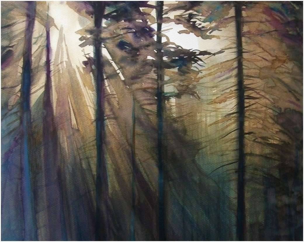 akwarela z cyklu leśnych iluminacji, oprawiona w kremowe passe-partout, zabezpieczona werniksem w spraju, sygnowana. W passe-partout wymiary wynoszą 50 cm x 60 cm.