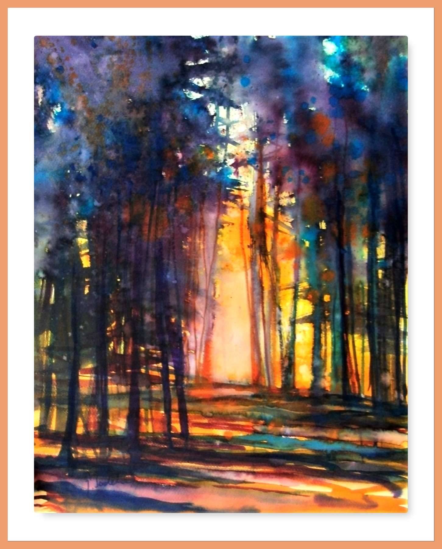 Akwarela o wymiarach 40 cm x 50 cm należąca do cyklu Leśnych iluminacji,namalowana na papierze akwarelowym Daler Rowney (300g). Praca sygnowana, oprawiona w passe-partout ( w passe-partout wymiary 50 cm x 60 cm )..