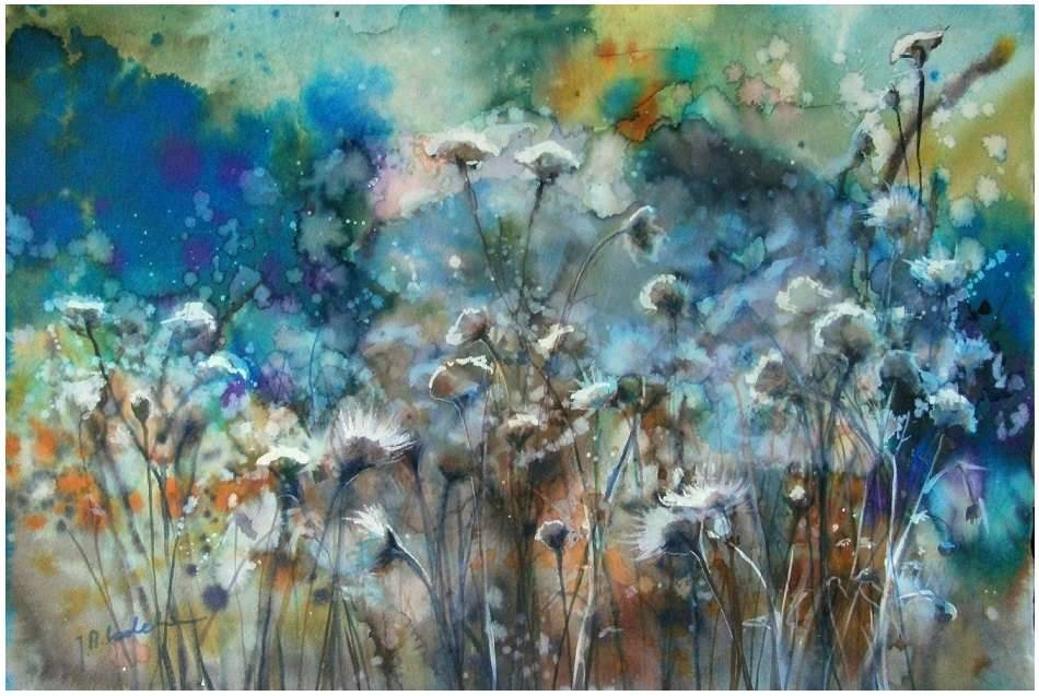 Duża ,nastrojowa akwarela przedstawiająca magiczny świat roślin. Praca jest namalowana na wysokiej jakości papierze akwarelowym Winsor & Newton, sygnowana w dolnym rogu, oprawiona w passe-partout. Wymiary akwareli z passe-partout wynoszą 50 cm x 70 cm. Obraz ten może stać sie uroczym prezentem dla romantyków i wielbicieli Natury. Wymiary: 38 cm x 56 cm Oprawa: passe-partout Rok powstania: 2020