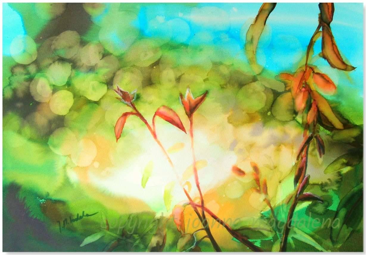 Słoneczna akwarela inspirowana magicznym światem przyrody . Praca o wymiarach 38 cm x 56 cm, sygnowana, namalowana na wysokiej jakości papierze akwarelowym o trwałosci archiwalnej (100% bawełny) . Praca jest oprawiona w passe-partout. Wymiary z passe-partout : 50 cm x 70 cm. Akwarela ta może stać się udanym prezentem dla miłośników Natury .