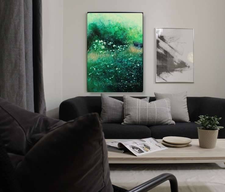 Duży, dekoracyjny obraz namalowany w technice mieszanej (akwarela, akryl, tusz) na płótnie na profesjonalnym podobraziu . Sygnowany w dolnym rogu, zabezpieczony werniksem. Boki zamalowane -gotowy do zawieszenia. Obraz ten wnosi do wnętrza romantyczną atmosferę, idealny prezent dla miłośników spokoju i natury.