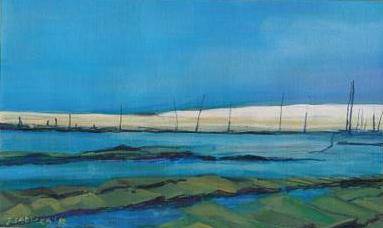 Polow ostryg w Bassin d'Arcachon, Francja.Akwarela oprawiona w passe-partout,zabezpieczona werniksem matowym, sygnowana.
