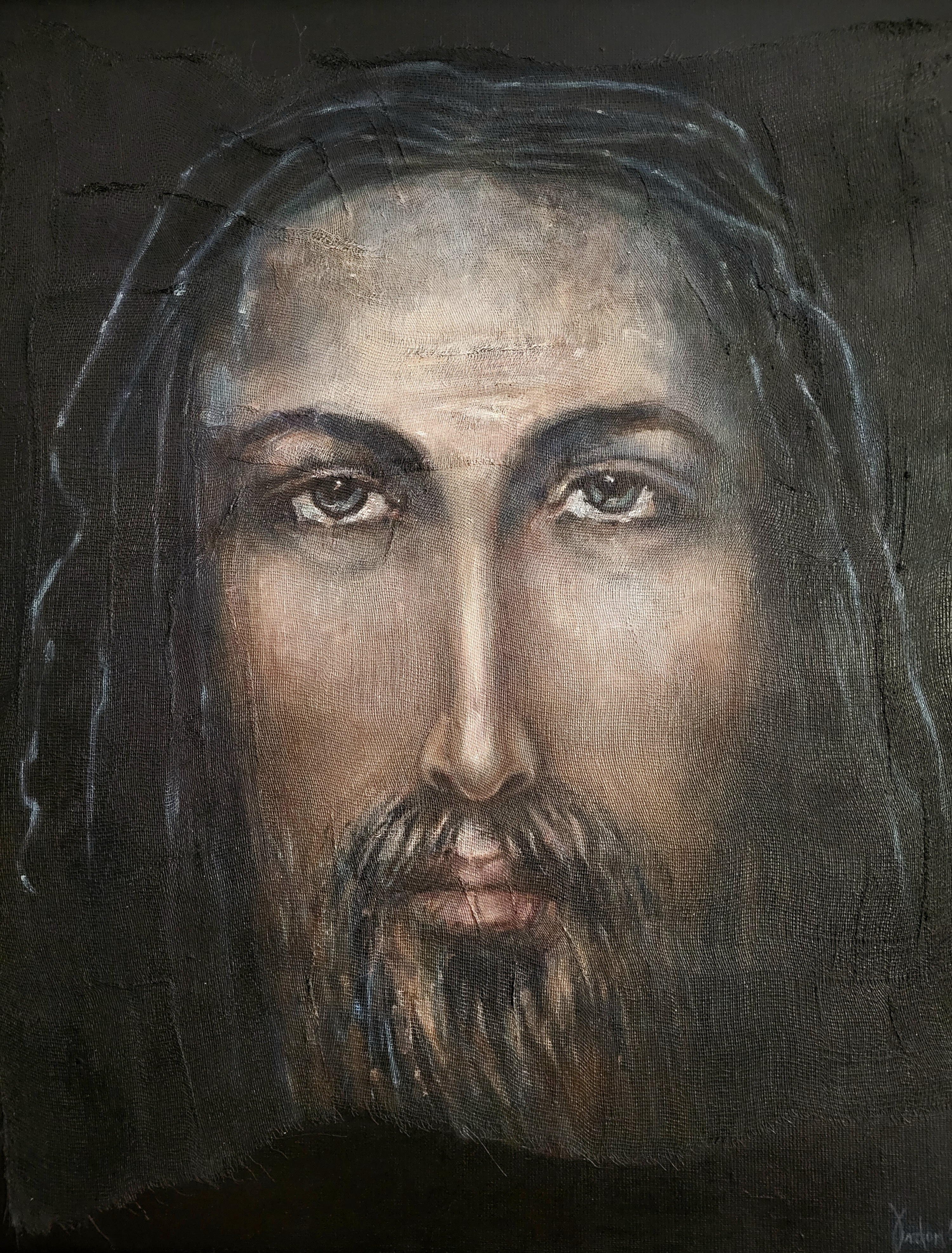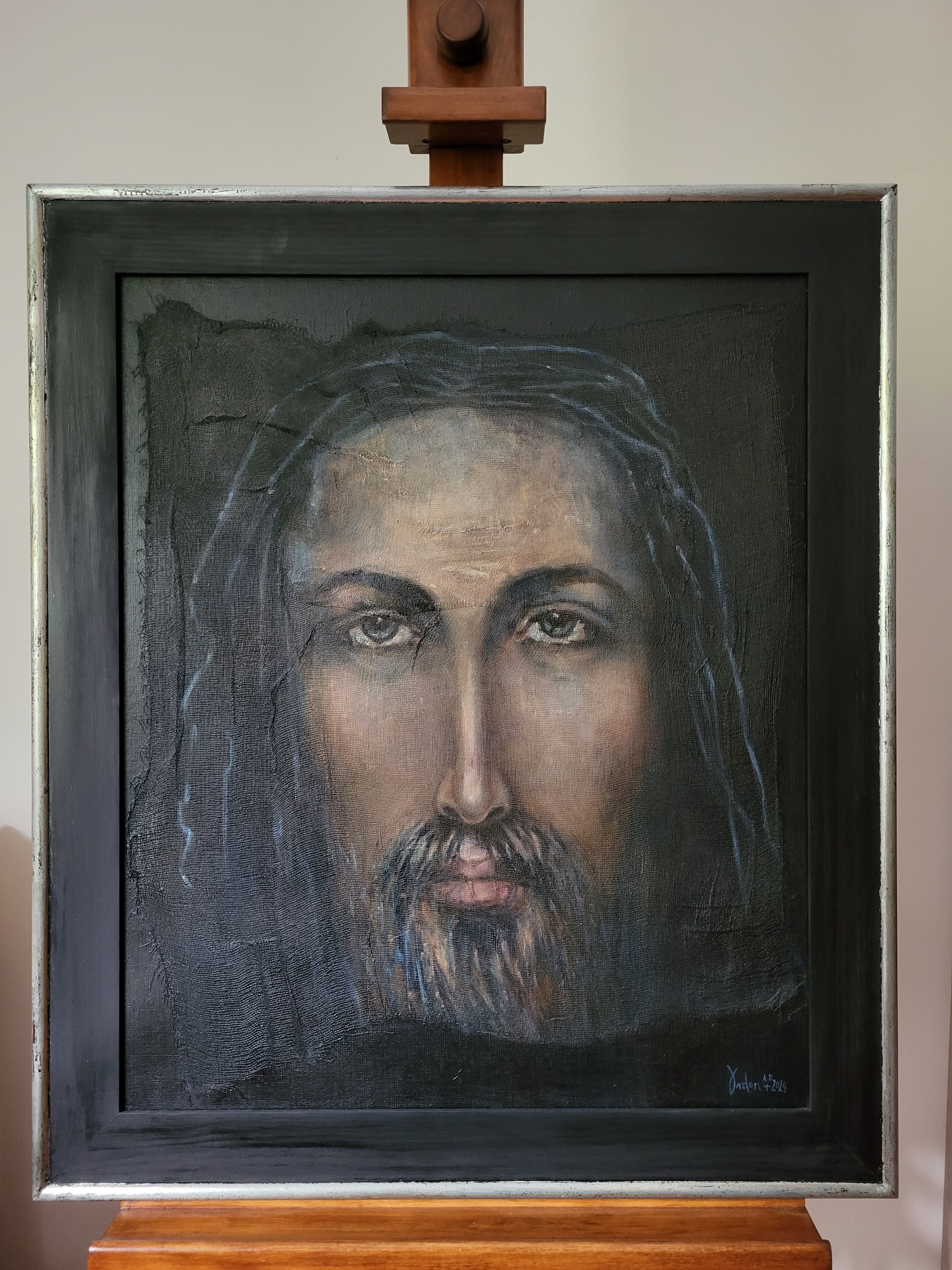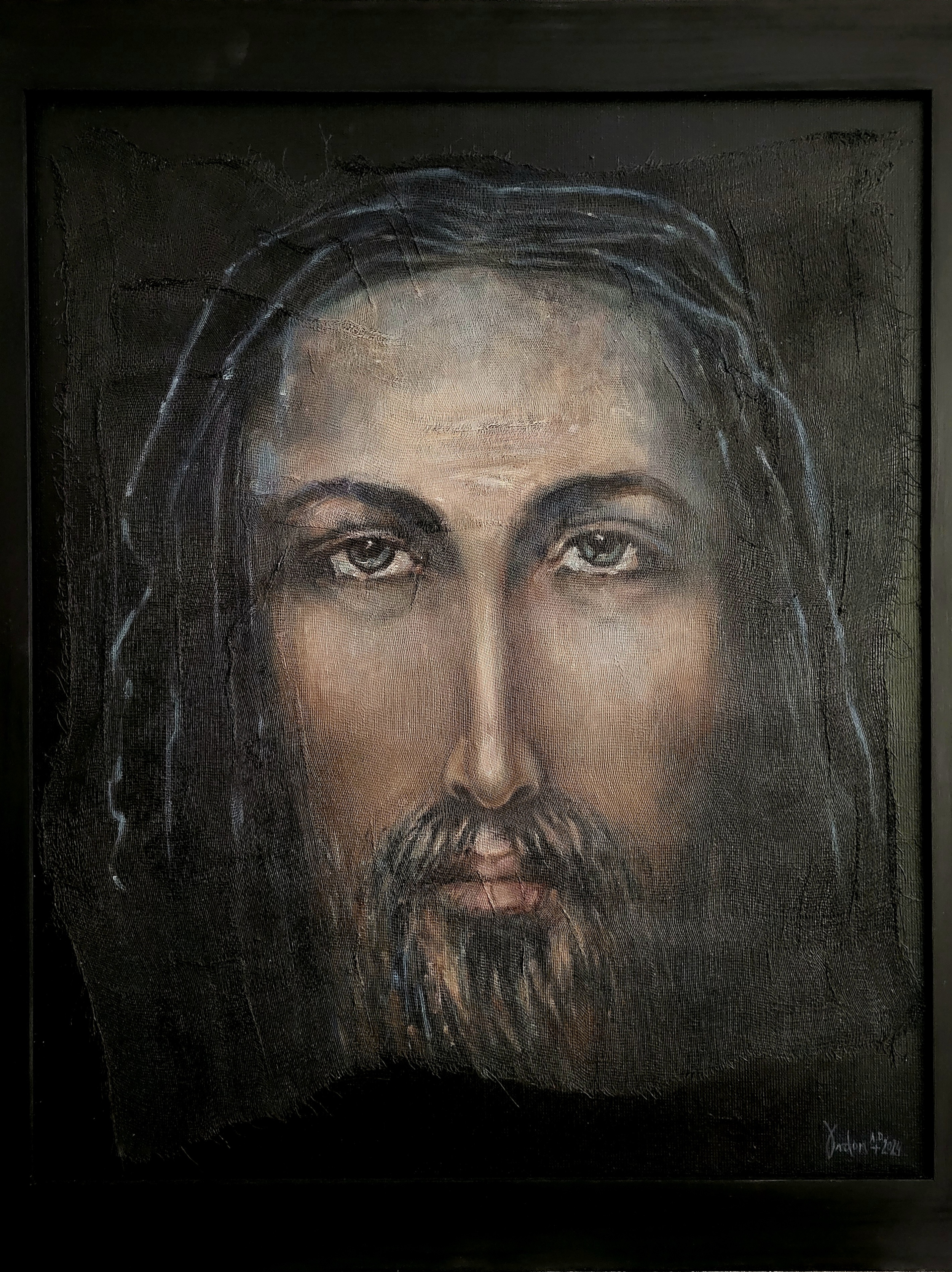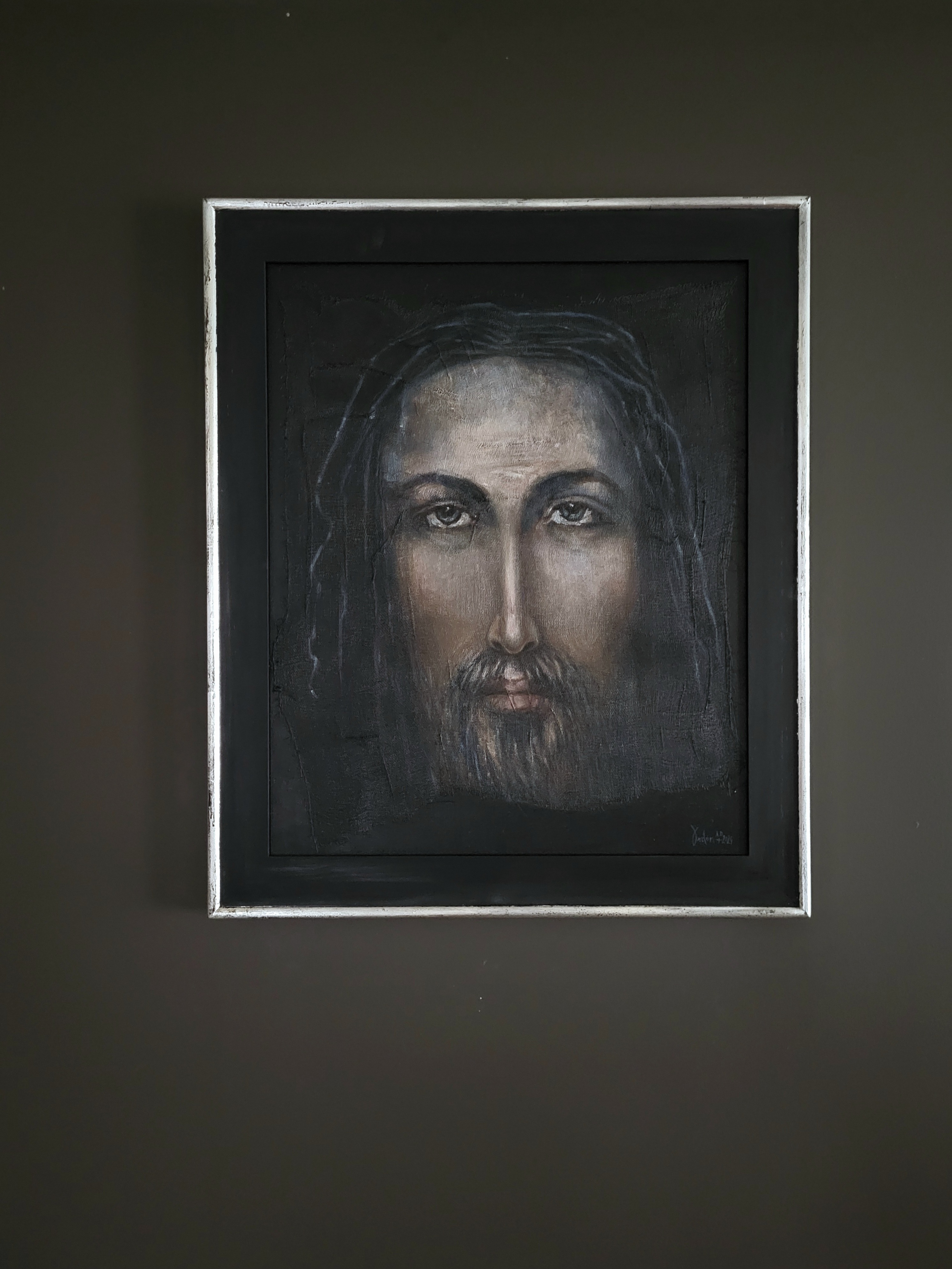 Obraz przedstawia oblicze o głębokim spojrzeniu, które zdaje się przenikać przez płótno. Stonowane barwy, głównie odcienie brązów i beżów, tworzą delikatną, ale mocną aurę tajemnicy. Kształty są wyraźne, choć lekko rozmyte, nadając dziełu efekt dreamlike. Kompozycja skupia się na postaci, która wypełnia niemal całą przestrzeń, co podkreśla intymność kontaktu wzrokowego. Atmosfera jest pełna zadumy, a może nawet melancholii. Przechodząc od formalnego pędzla do luźniejszego impastu, artysta uzyskuje teksturę przypominającą starą fotografię. Patrząc na to dzieło, czuć pewną duchowość, jakby obraz mówił: stop, zatrzymaj się na chwilę. Może wywołać w odbiorcy refleksję nad przemijaniem albo poszukiwaniem wewnętrznego spokoju i sensu życia. Technika malarska, choć klasyczna, zaskakuje swoim minimalizmem i oszczędnością detali. Patrząc na ten obraz, można odnieść wrażenie, że spojrzenie, choć nieruchome, przy przechodzeniu przed obrazem zdaje się podążać za oglądającym. To spojrzenie przykuwa uwagę i kryje w sobie zaproszenie do wejścia w osobową relację . Technika własna - specjalna faktura podłoża , jakby płótno na płótnie. Obraz oprawiony w drewnianą ramę, stylizacja ramy wykonana przez autora obrazu. Obraz wpisuje sie w cykl pt." Szukam Twego Oblicza"