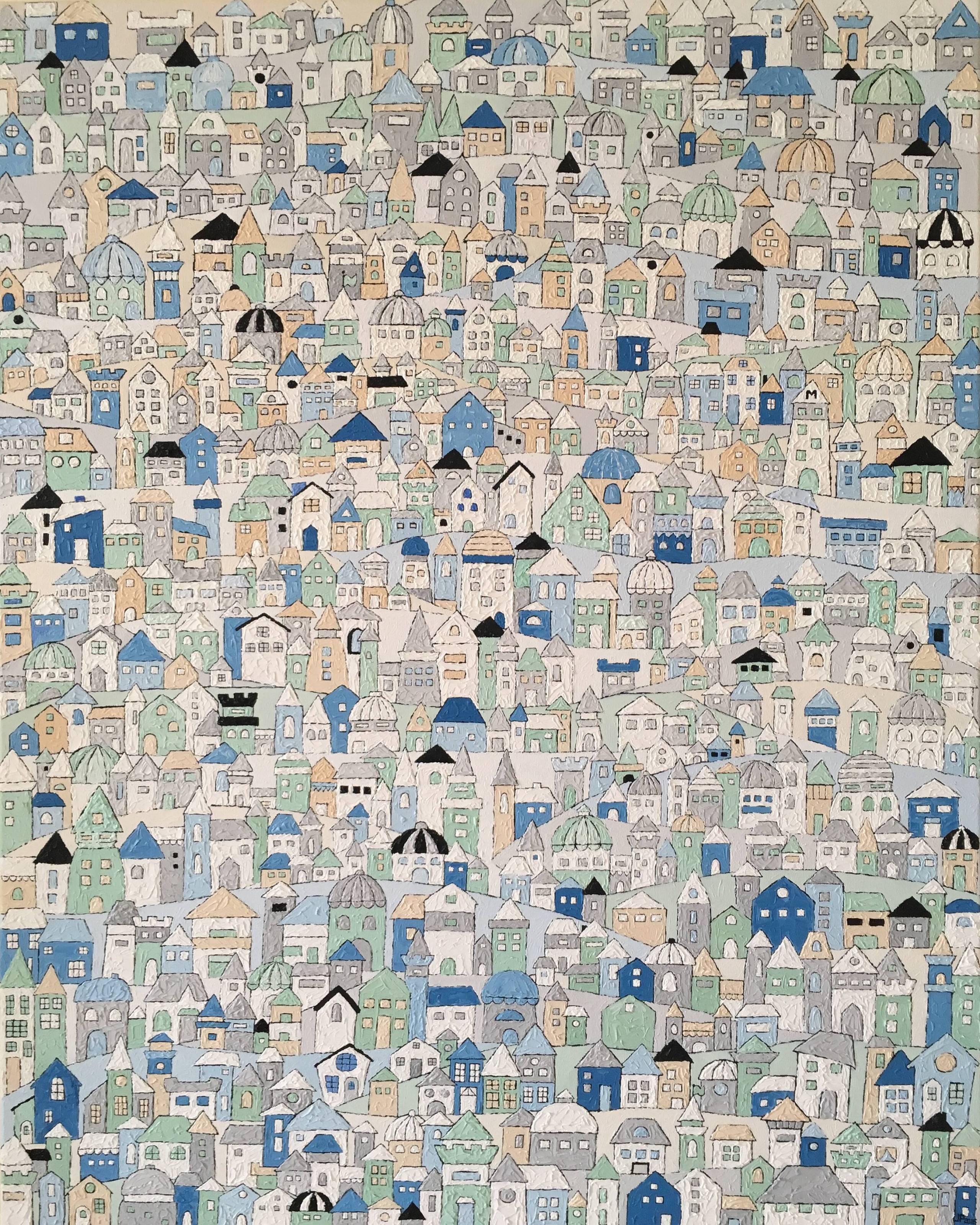 Spoglądając na obraz, czujesz, jakbyś wędrował po miniaturowym miasteczku, gdzie każdy domek ma swoją historię. Dominują przyjemne, pastelowe kolory: błękity, zielenie i ciepłe beże. Kształty budynków są zróżnicowane, od prostych sześcianów po bardziej skomplikowane kopuły i wieże. Każdy szczegół przyciąga wzrok, tworząc wrażenie harmonijnego chaosu. W tej scence jest coś magicznego, prawdziwa "wonderland" dla oczu. Atmosfera obrazu jest spokojna, niemal sielankowa, jakby czas zwolnił, a codzienność nabrała baśniowego wymiaru. Styl przypomina trochę dziecięce rysunki, ale z dojrzałością i finezją, które przyciągają zarówno małych, jak i dużych. Wzbudza to w odbiorcy nostalgiczne uczucie, przypominając o dzieciństwie i beztroskich zabawach. Maluch powie: "O, to wygląda jak moja bajkowa wioska!" Technika artystyczna jest delikatna, emanując wdziękiem i subtelnością, przy jednoczesnym zachowaniu wyraźnych konturów. Każda linia wydaje się być tu na właściwym miejscu. Dla mnie ten obraz to podróż w czasie. Jest w nim coś, co każe zatrzymać się na chwilę, zapatrzyć i pomarzyć o spokojnym zakątku, gdzie życie płynie wolniej. To jak otworzyć okno na inny świat, gdzie wszystko jest możliwe.