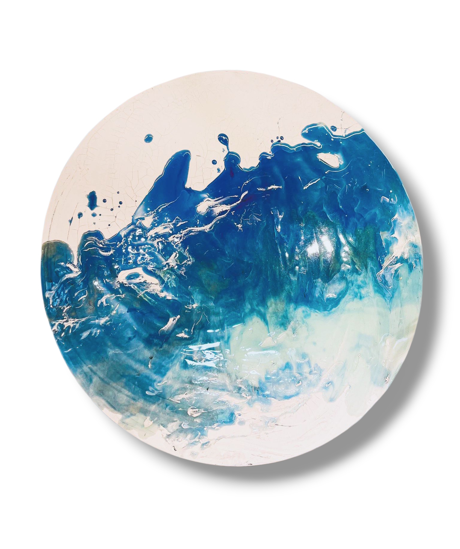 „Oddech morza” Joanny Pyrskały to nowoczesna, abstrakcyjna praca w formie koła o średnicy 50 cm, wykonana z wykorzystaniem technik mieszanych, które tworzą głębię, fakturę i subtelny ruch kompozycji. Obraz emanuje spokojem i lekkością, przywodząc na myśl rytm fal i delikatne oddechy morskiej tafli. Linie i kolory splatają się w harmonijną całość, balansując między tym, co namacalne, a tym, co ulotne i wyobrażone. Praca odzwierciedla relację między naturą a emocjami – ciszę, przestrzeń i światło, które stają się nośnikiem refleksji i wyciszenia. „Oddech morza” jest wyrazem minimalistycznej elegancji, doskonale komponując się w nowoczesnych wnętrzach, wprowadzając do przestrzeni atmosferę spokoju, harmonii i subtelnego, luksusowego charakteru. Technika mieszana: ekologiczna żywica, farby akrylowe.